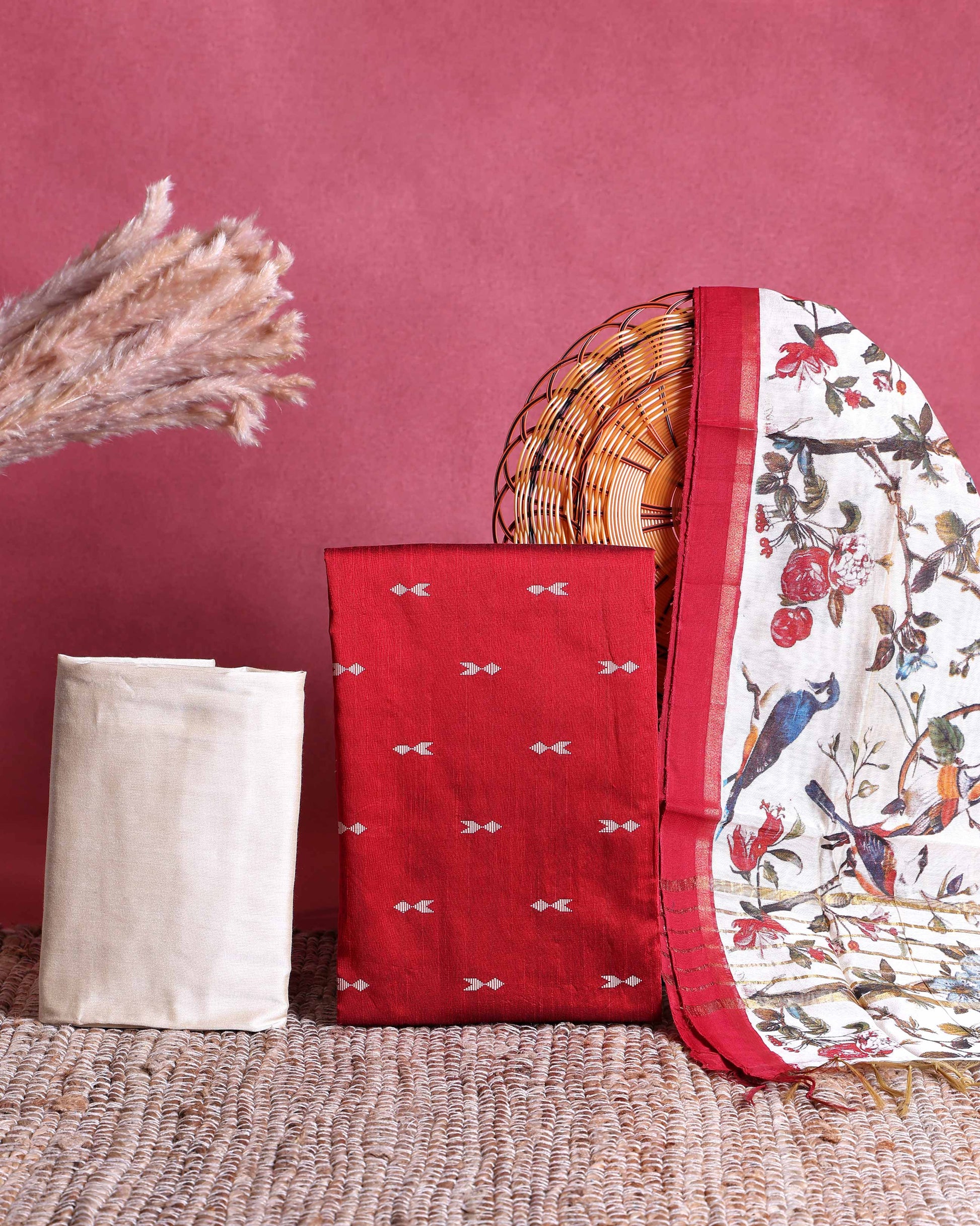Design - Ethnic Bird & Floral Motif Design Dupatta with Minimal Buti Top and Solid Bottom