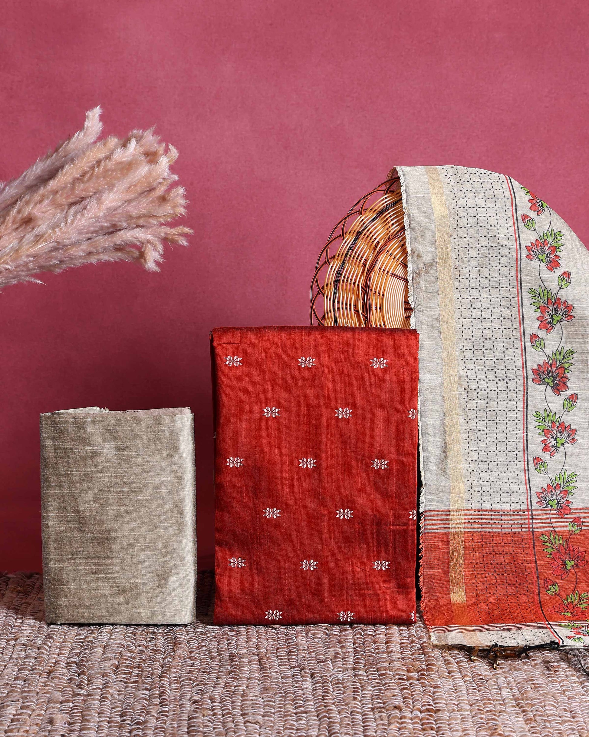 - Elegant women’s salwar suit material set a woven butti design top coordinated solid bottom and a beautifully printed floral dupatta with traditional border.