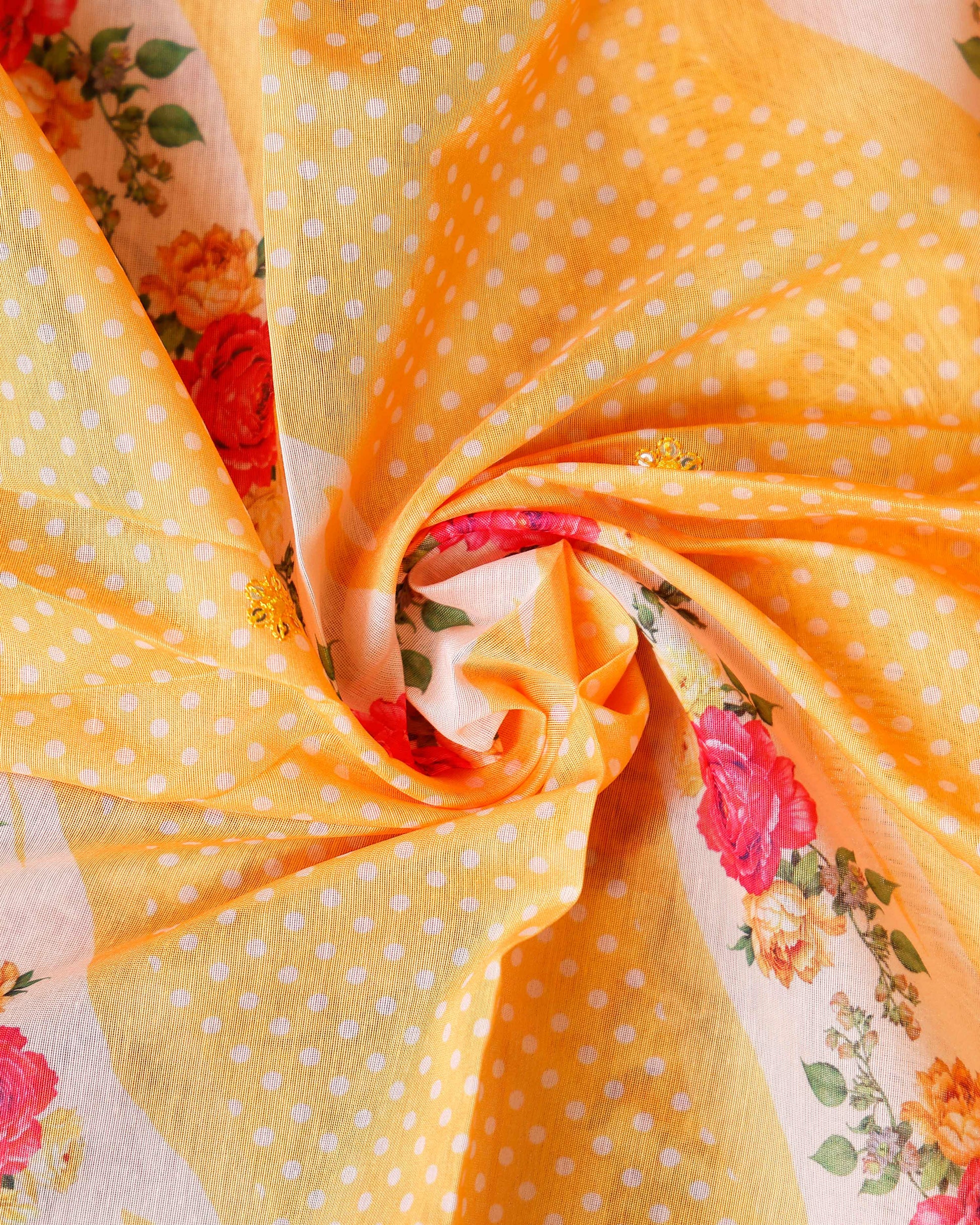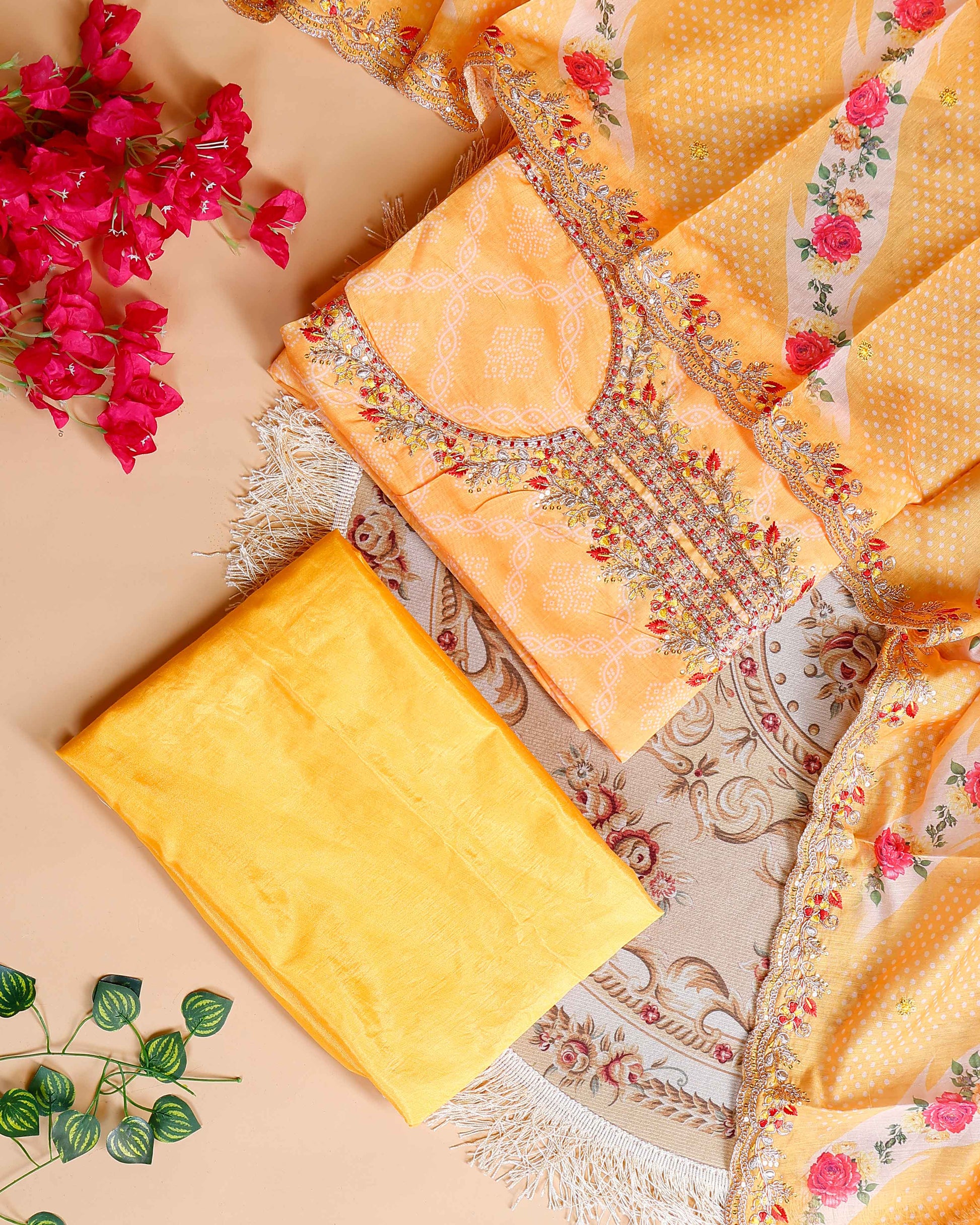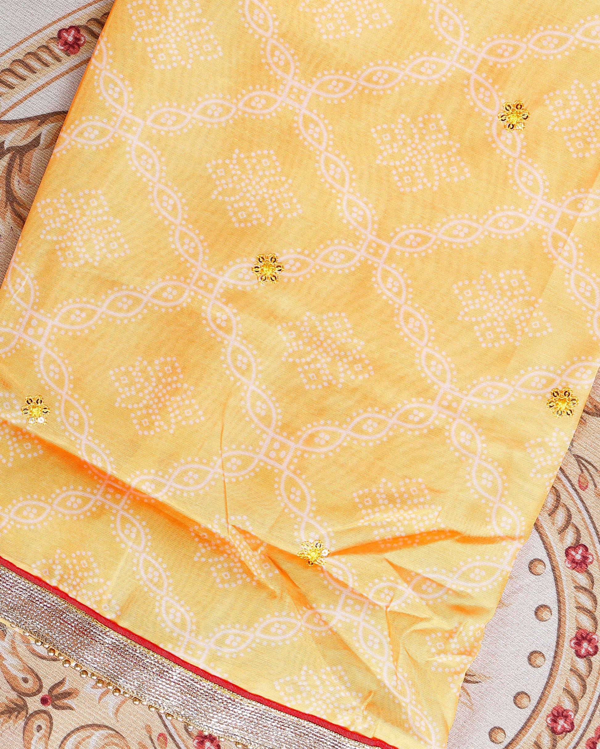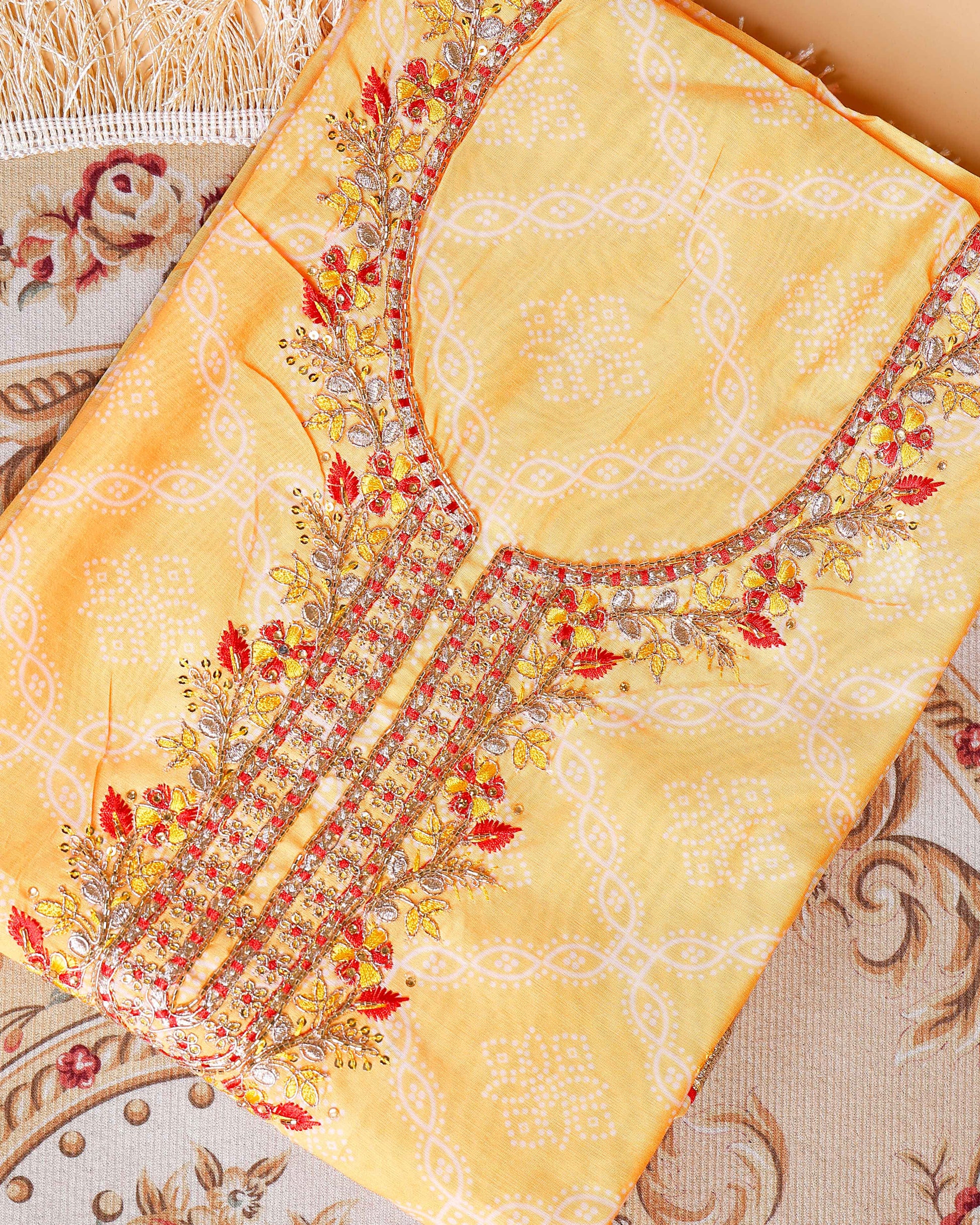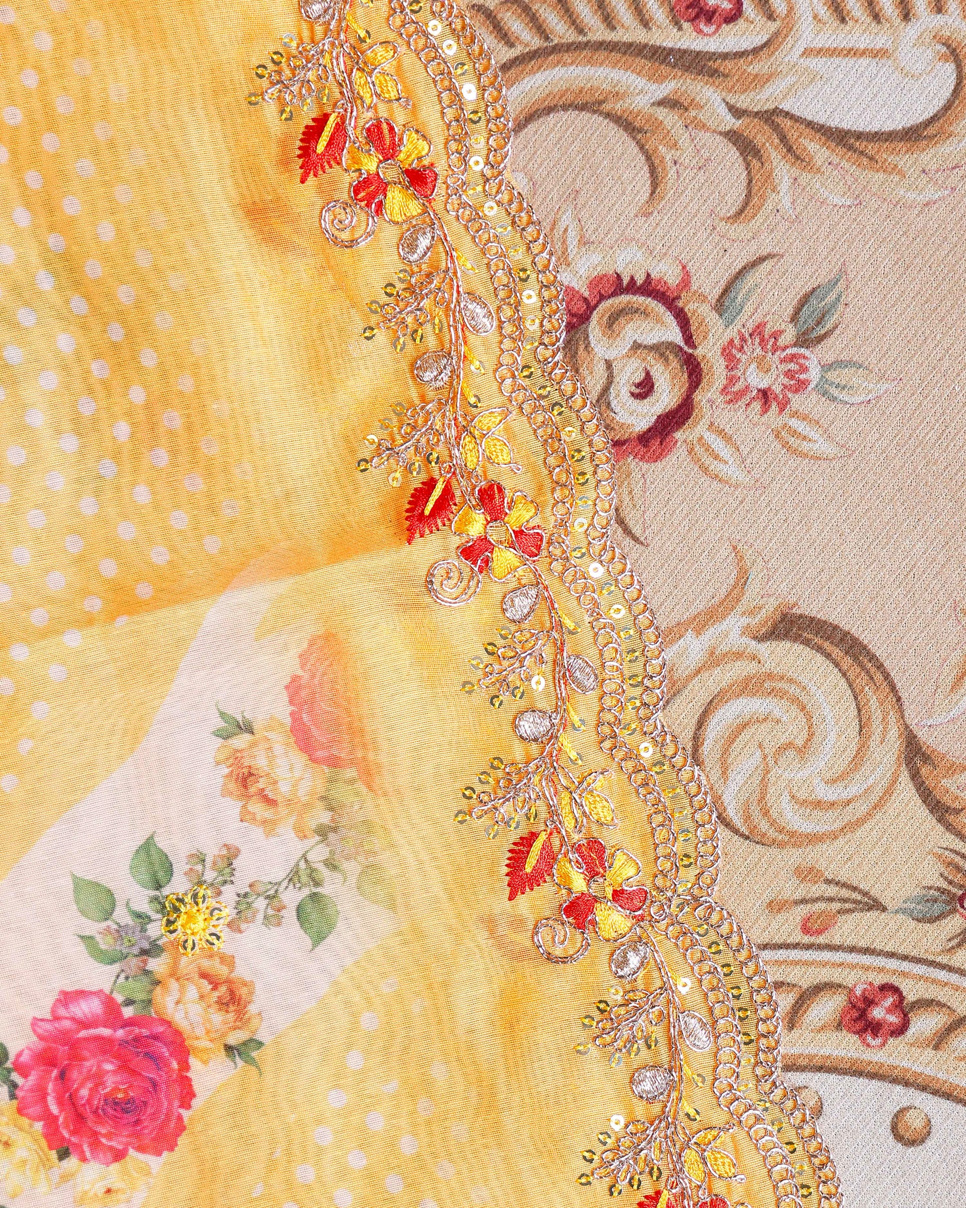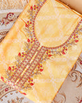 Women's Embroidered Neckline Printed Unstitched Salwar Material with Coordinating Dupatta- Yellow
