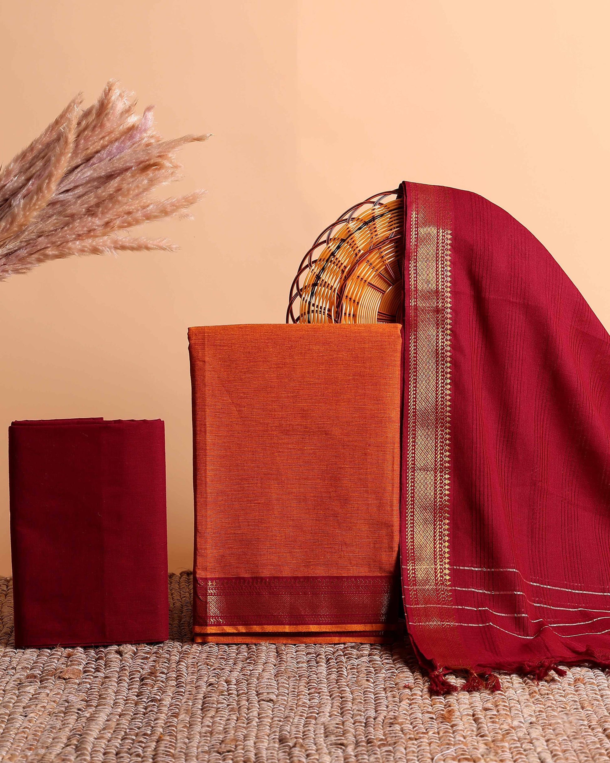 - Elevate your traditional style with this unstitched cotton salwar material a rich rust orange top and a contrasting maroon dupatta adorned with a classic zari border.