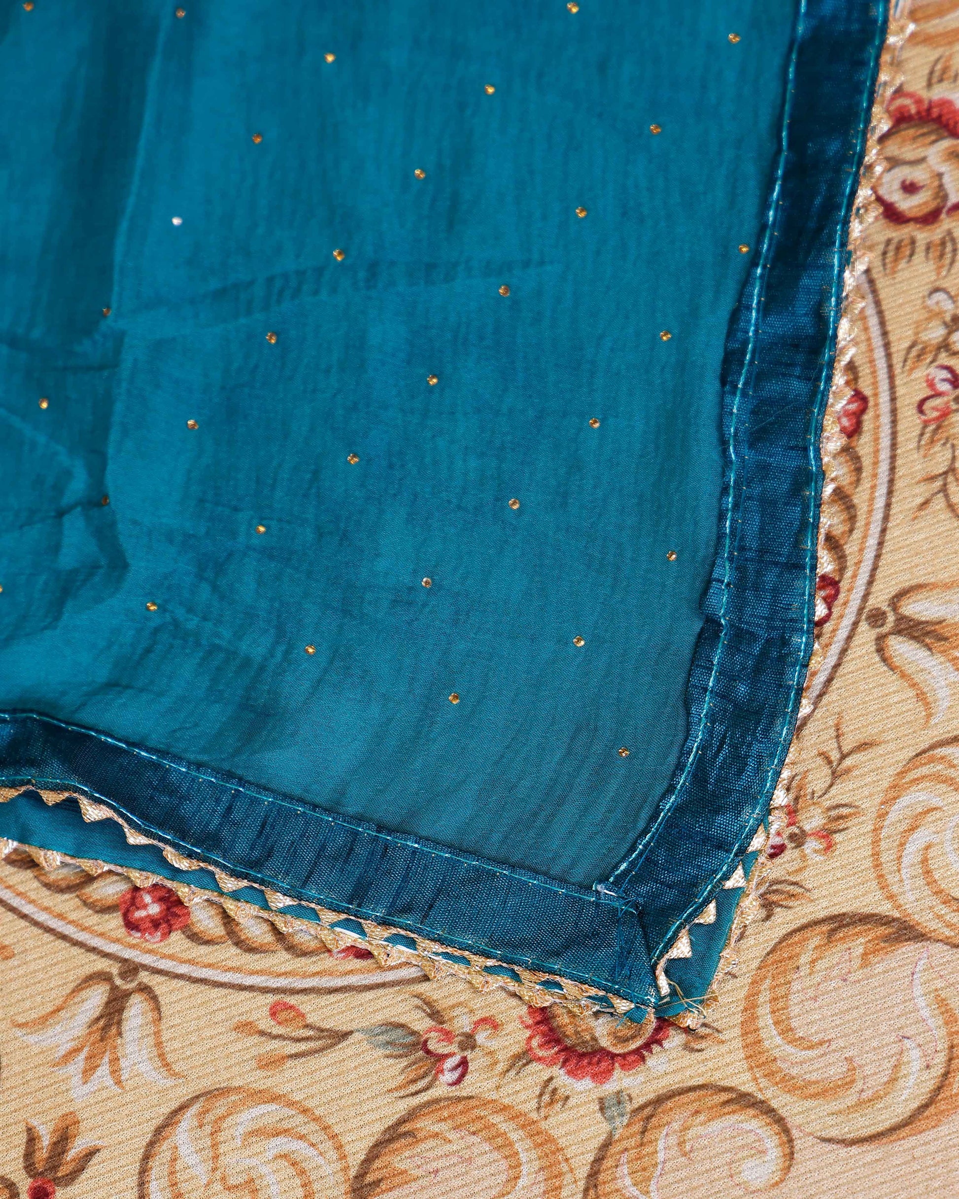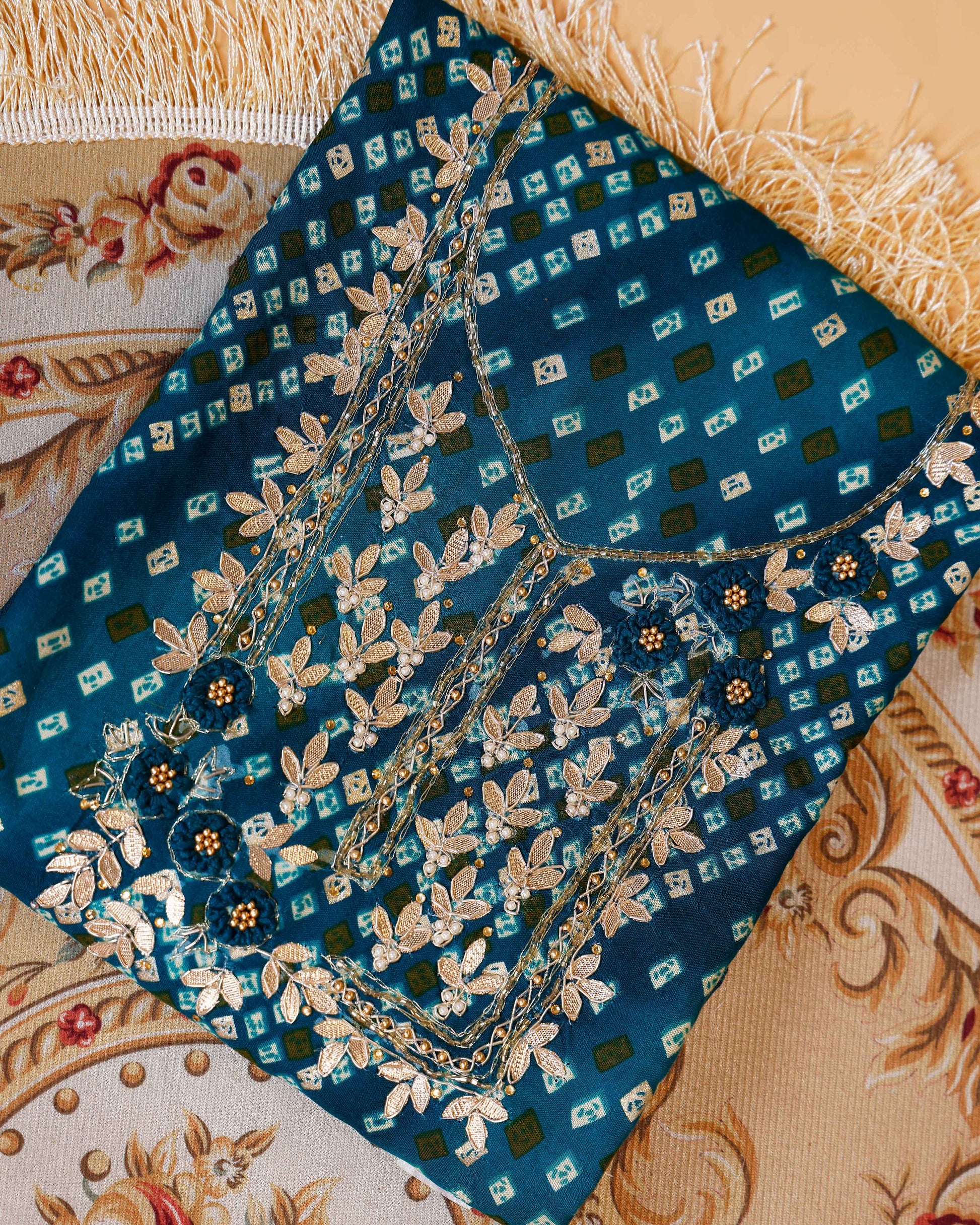 Embroidered Bandhani Print Salwar Suit Material with Zari and Floral Embellishments - Teal