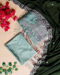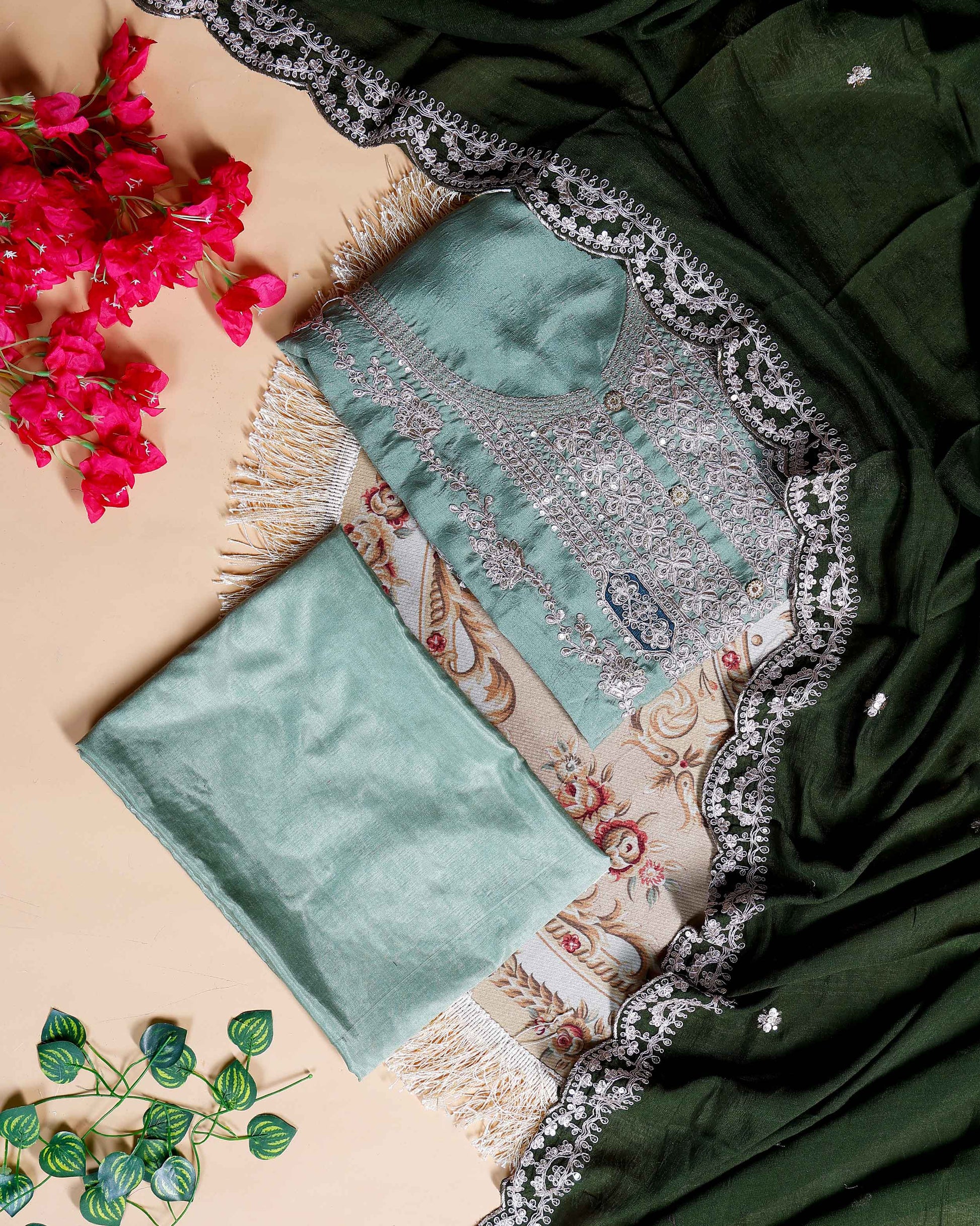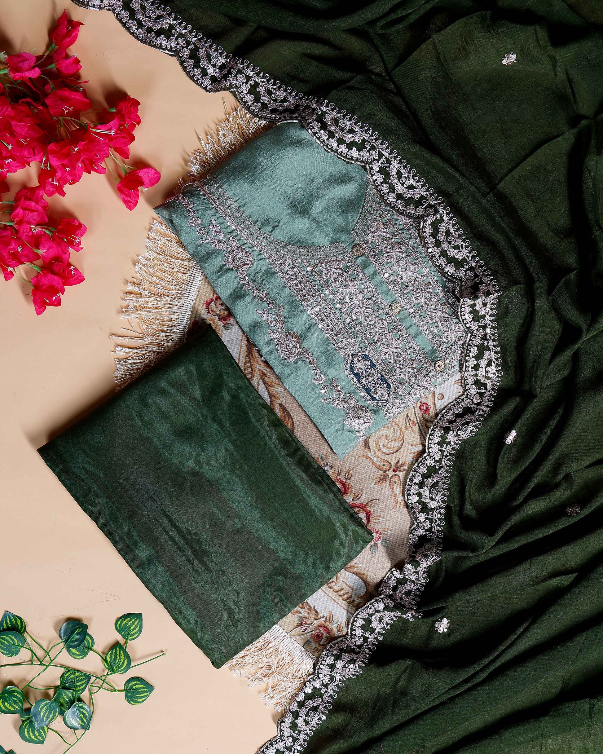 Women's Embroidered Unstitched Salwar Suit Material with Sequins and Scalloped Dupatta Border- Green