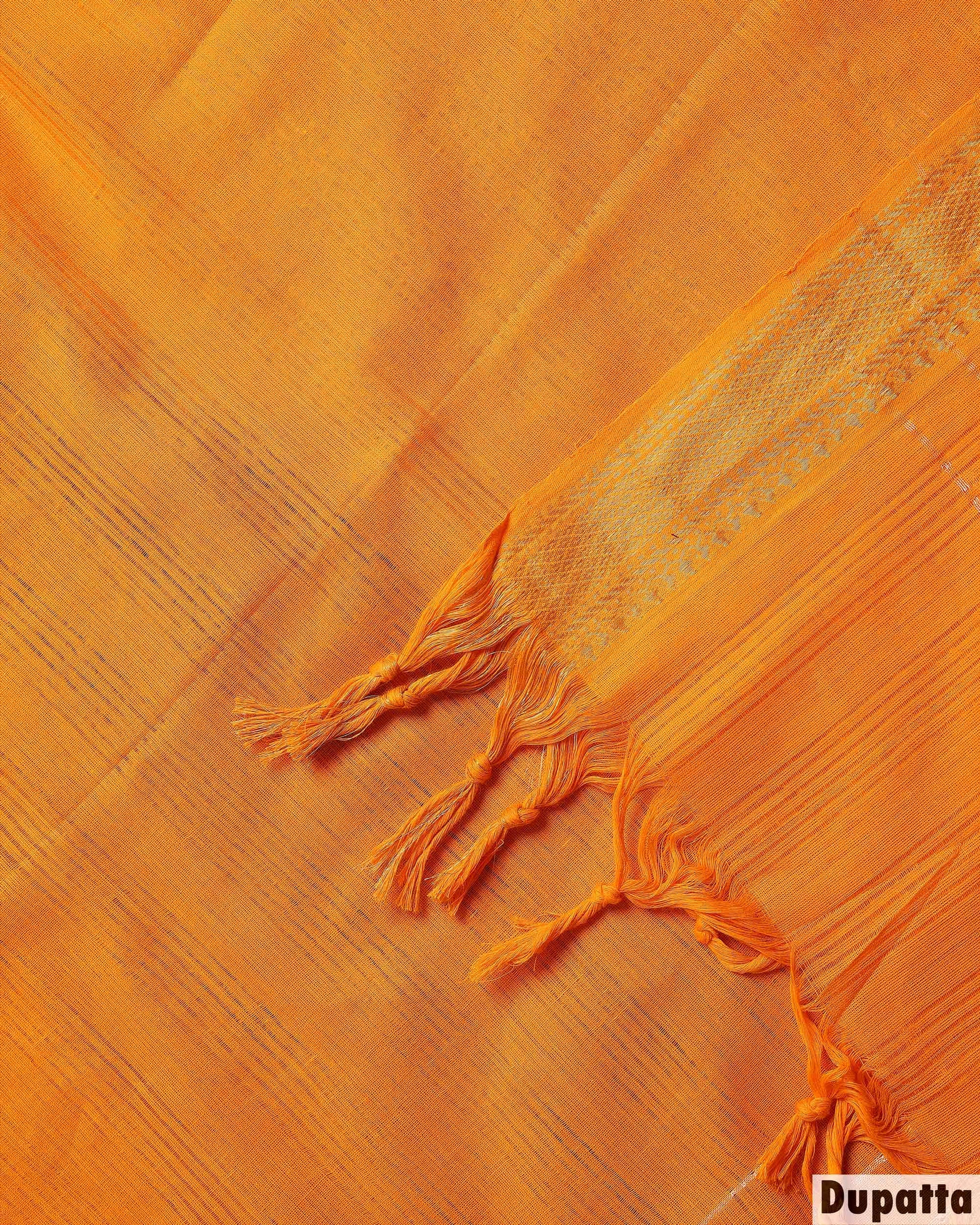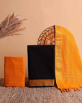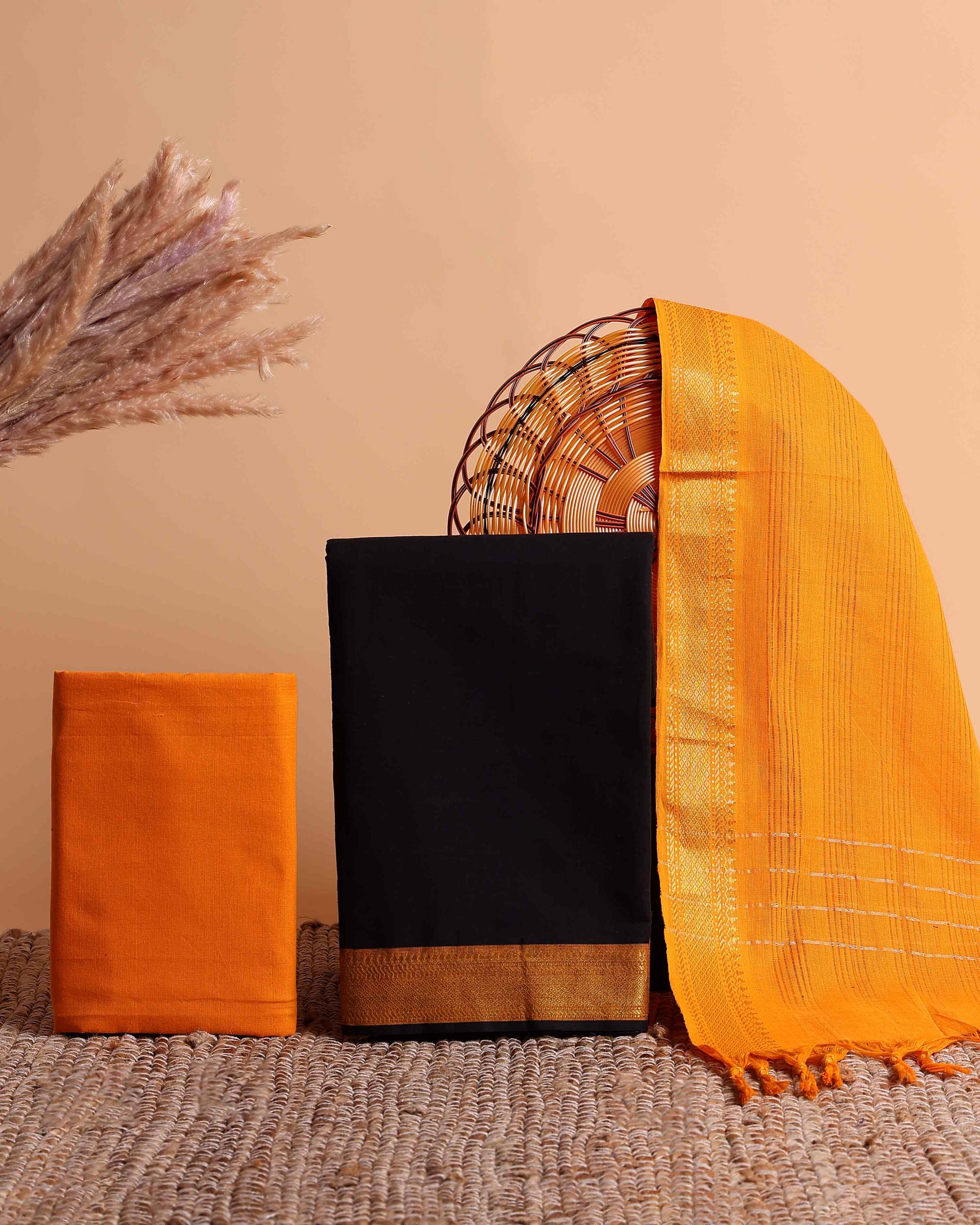 - Elevate your traditional style with this unstitched cotton salwar material a rich Black top and a contrasting Yellow dupatta adorned with a classic zari border.