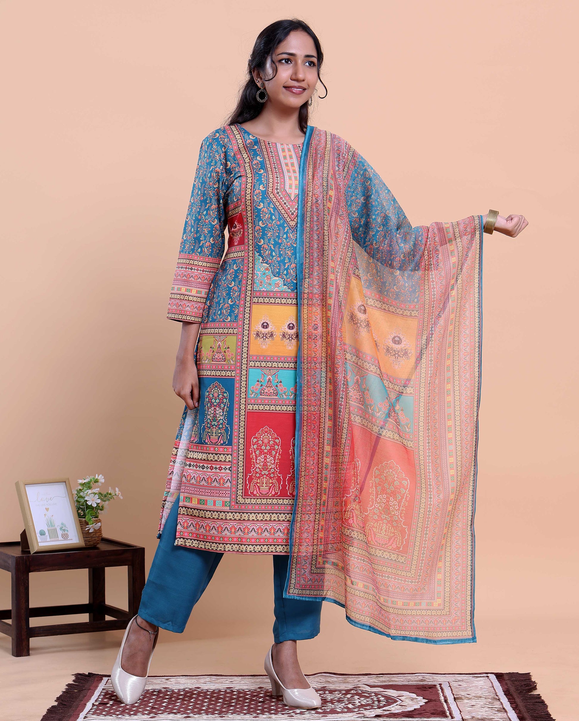 - Elevate your ethnic wear collection with this stunning readymade salwar suit set, a vibrant, multi-colored printed kurta, matching pants, and a beautiful dupatta.