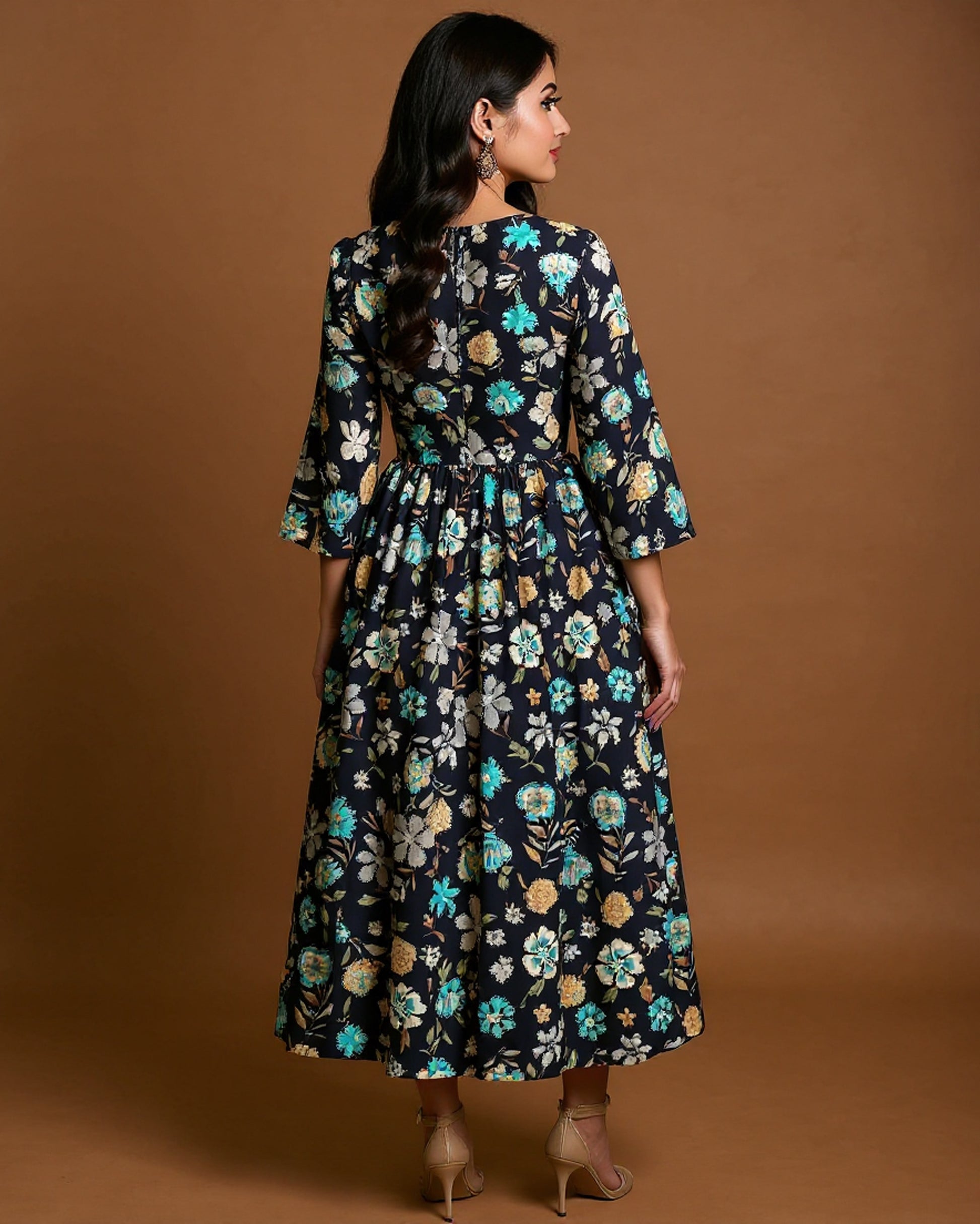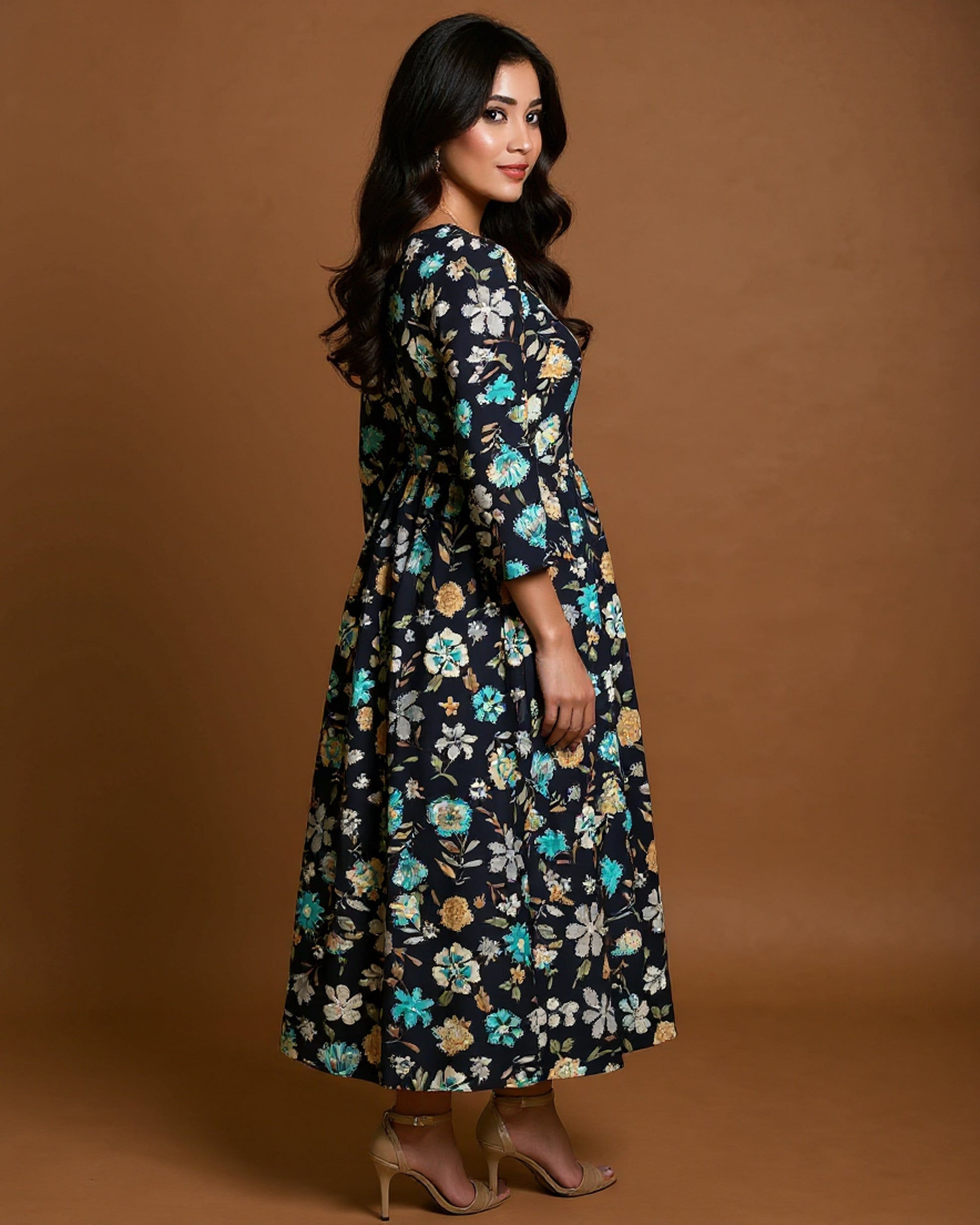 - This elegant navy blue floral print maternity dress offers both style and comfort