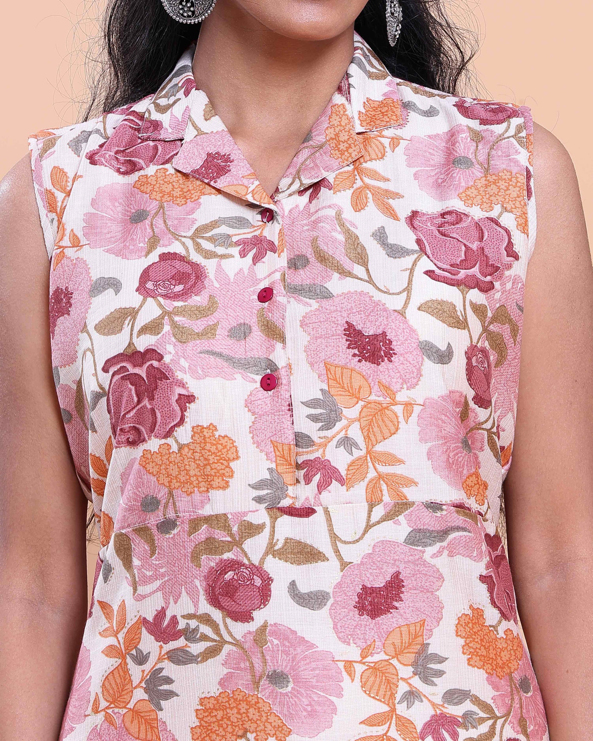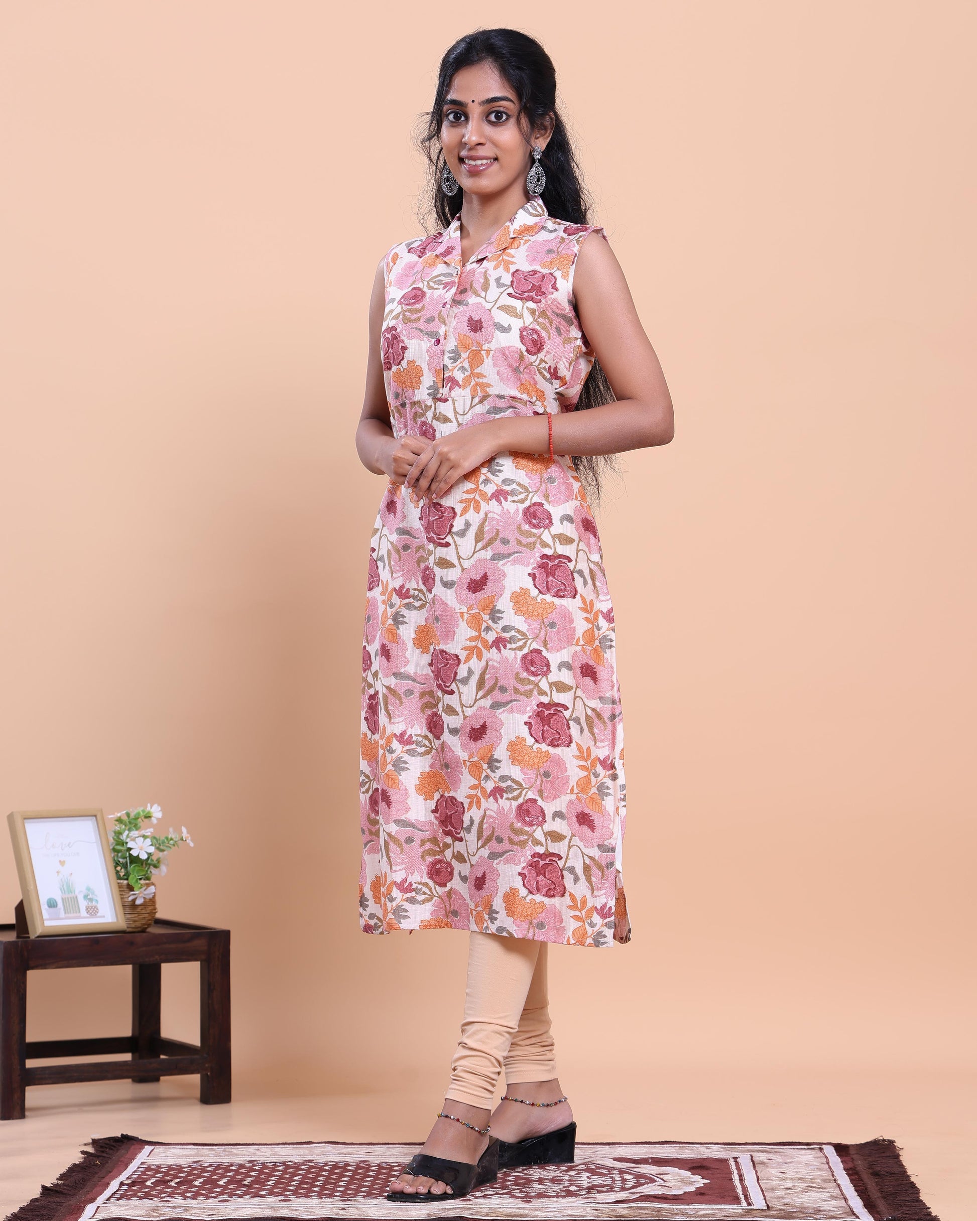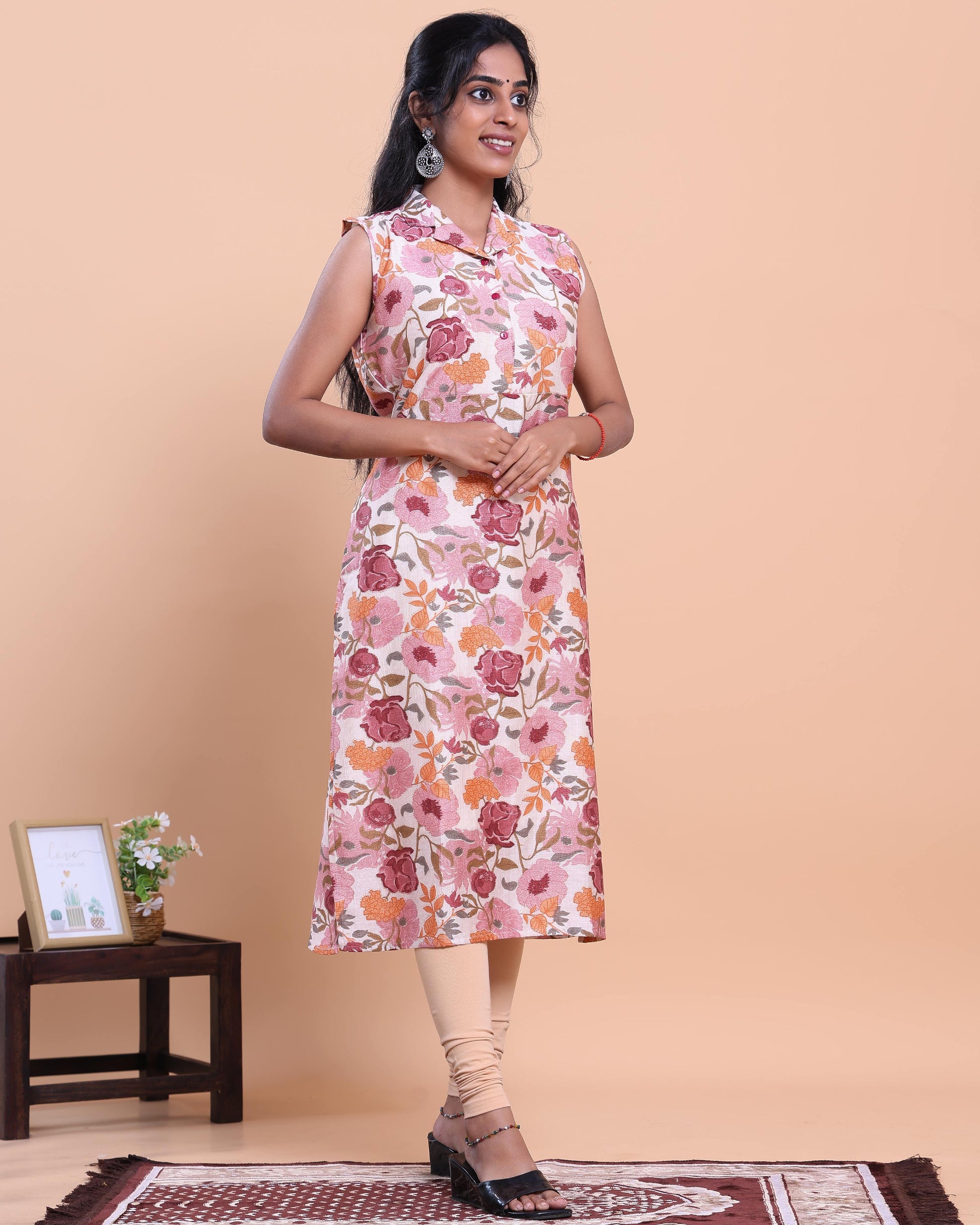 - Elevate your everyday style with this floral printed sleeveless kurta a classic shirt collar and a comfortable straight fit