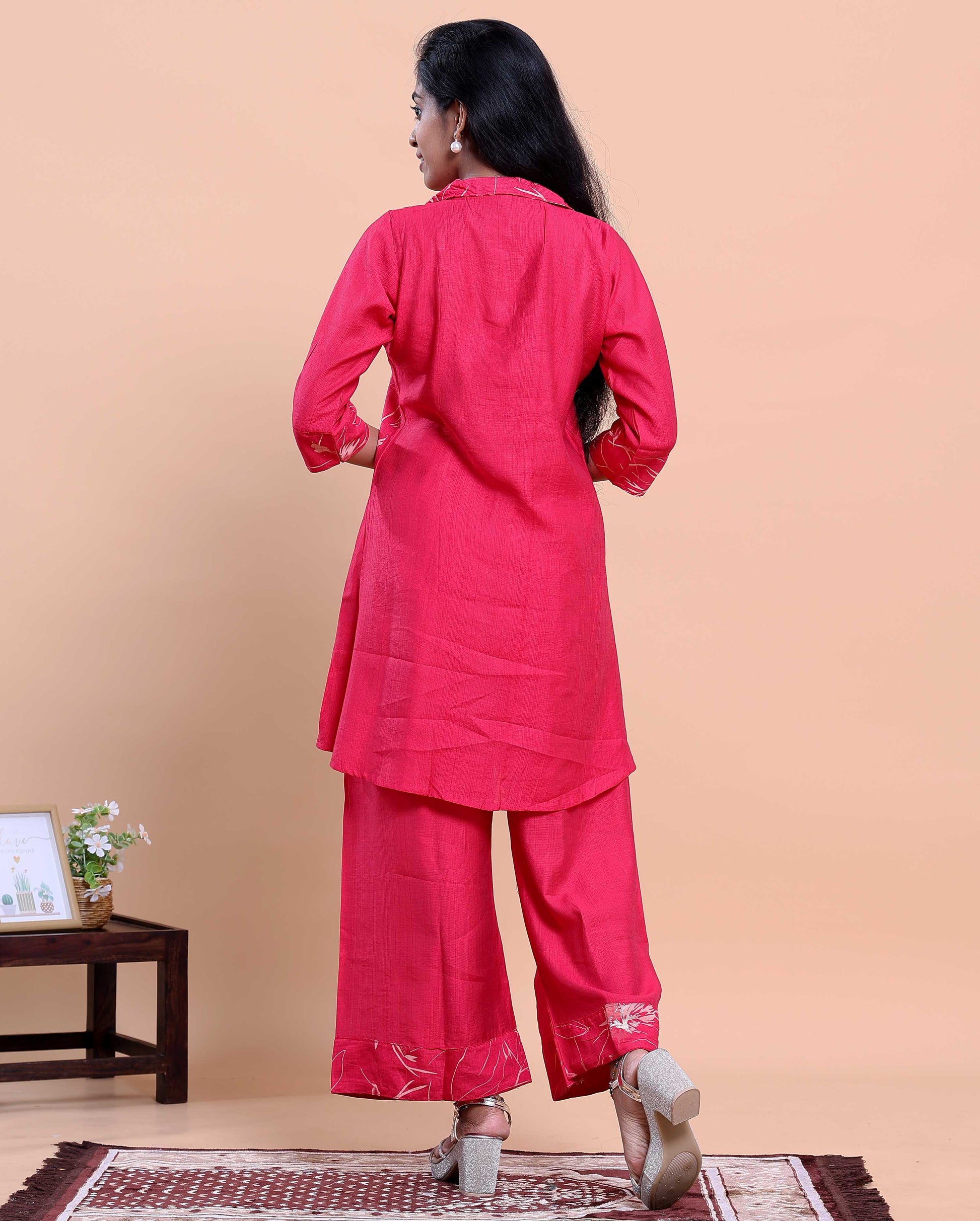 Women's Floral Embroidered Shirt-Collar Kurta with Wide-Leg Pants - Pink