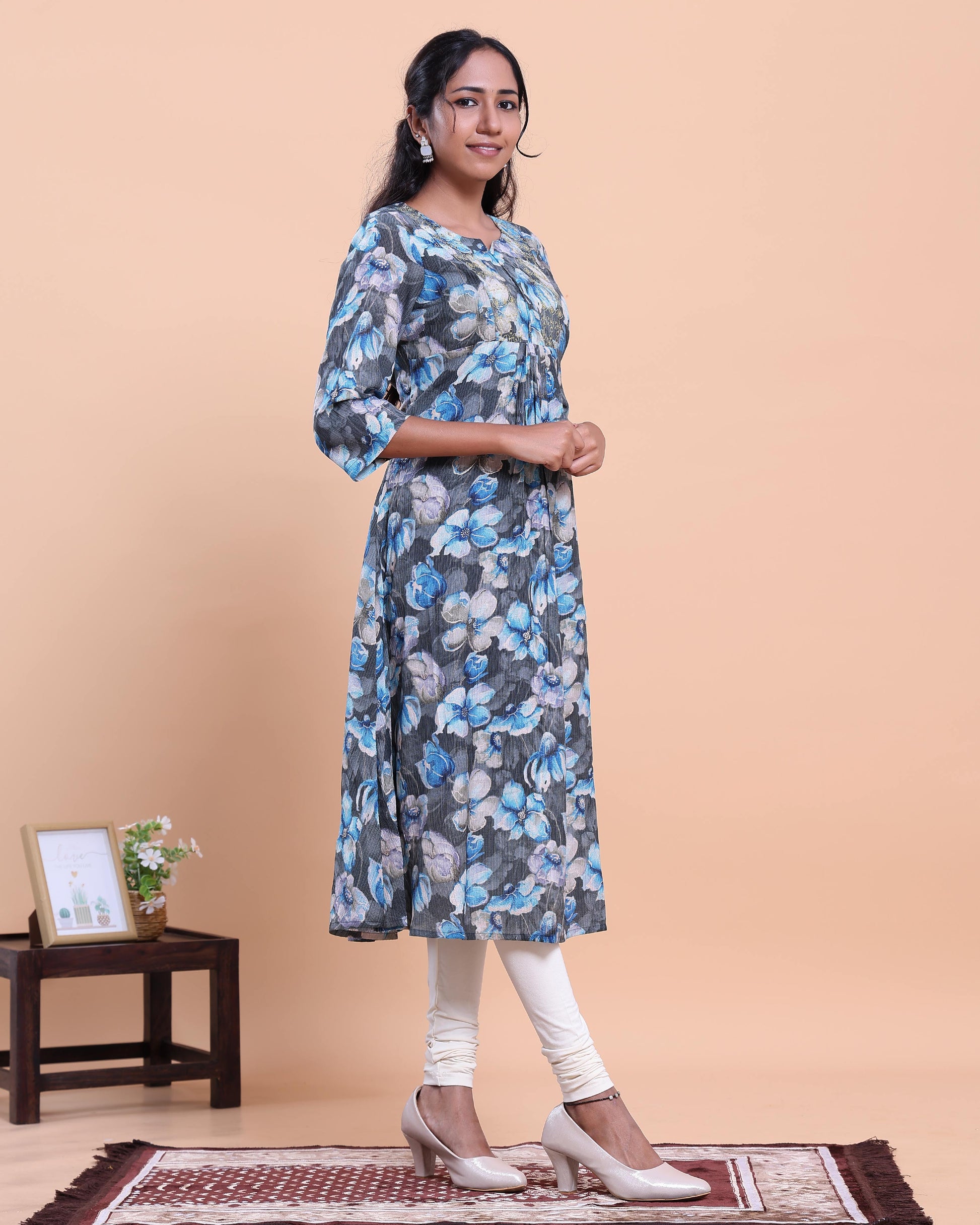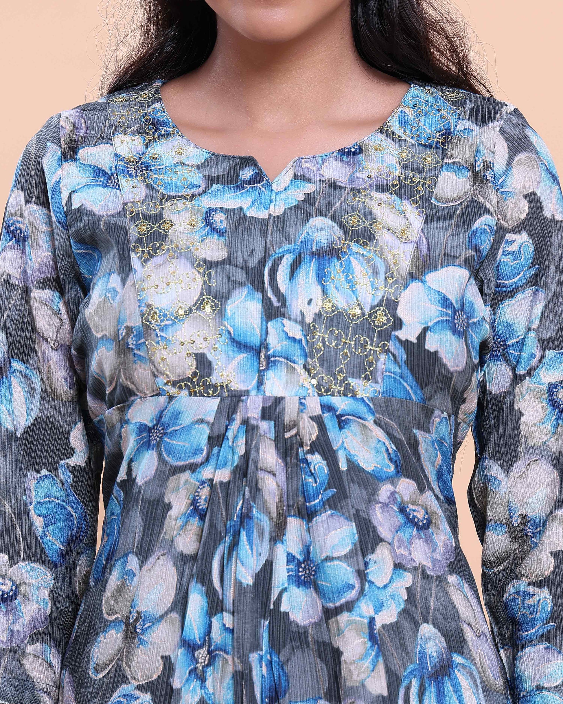 - Elevate your style with this elegant floral A-line kurta, a beautiful print in shades of blue and grey on a dark background