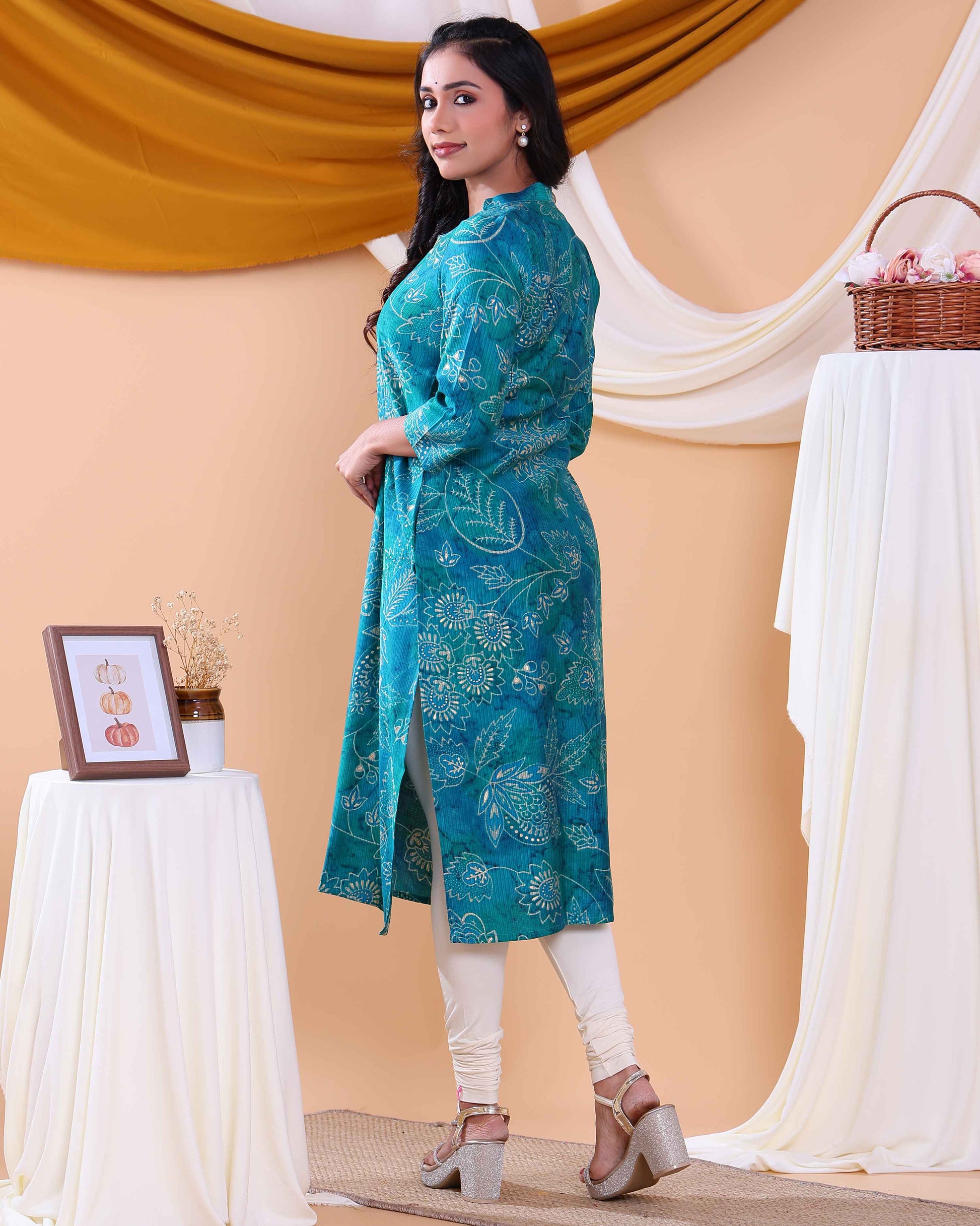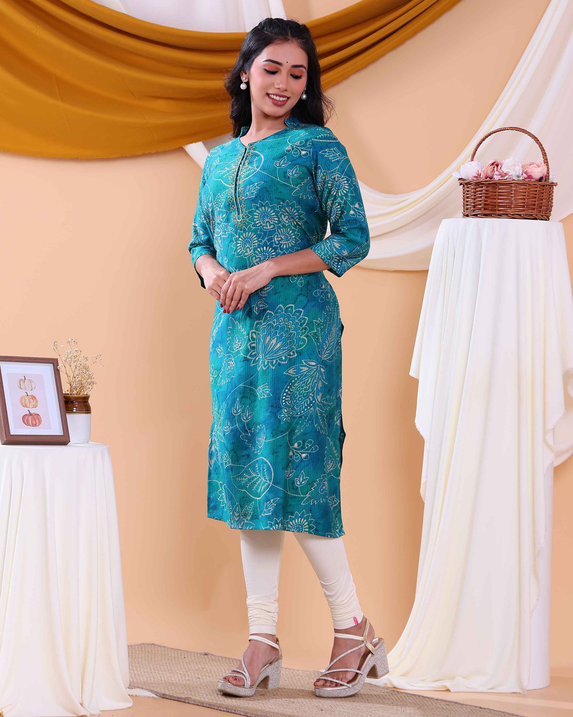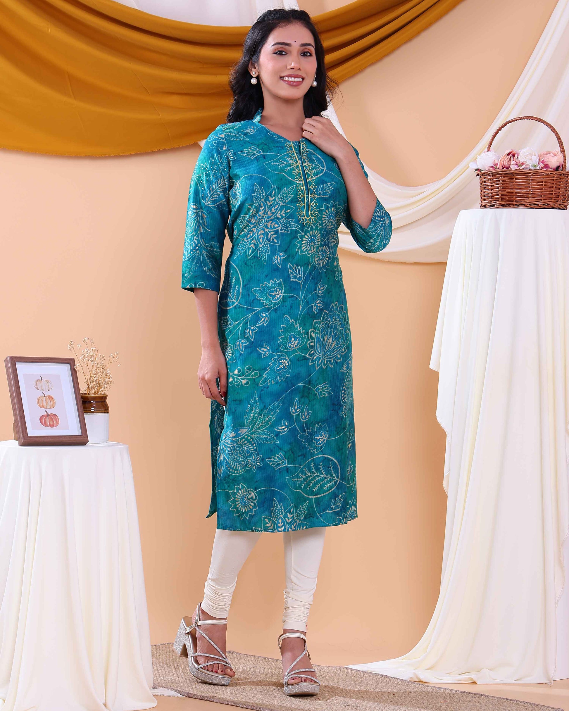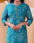 Women's Floral Printed Straight Kurta with 3/4th Sleeves - Blue