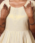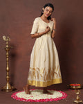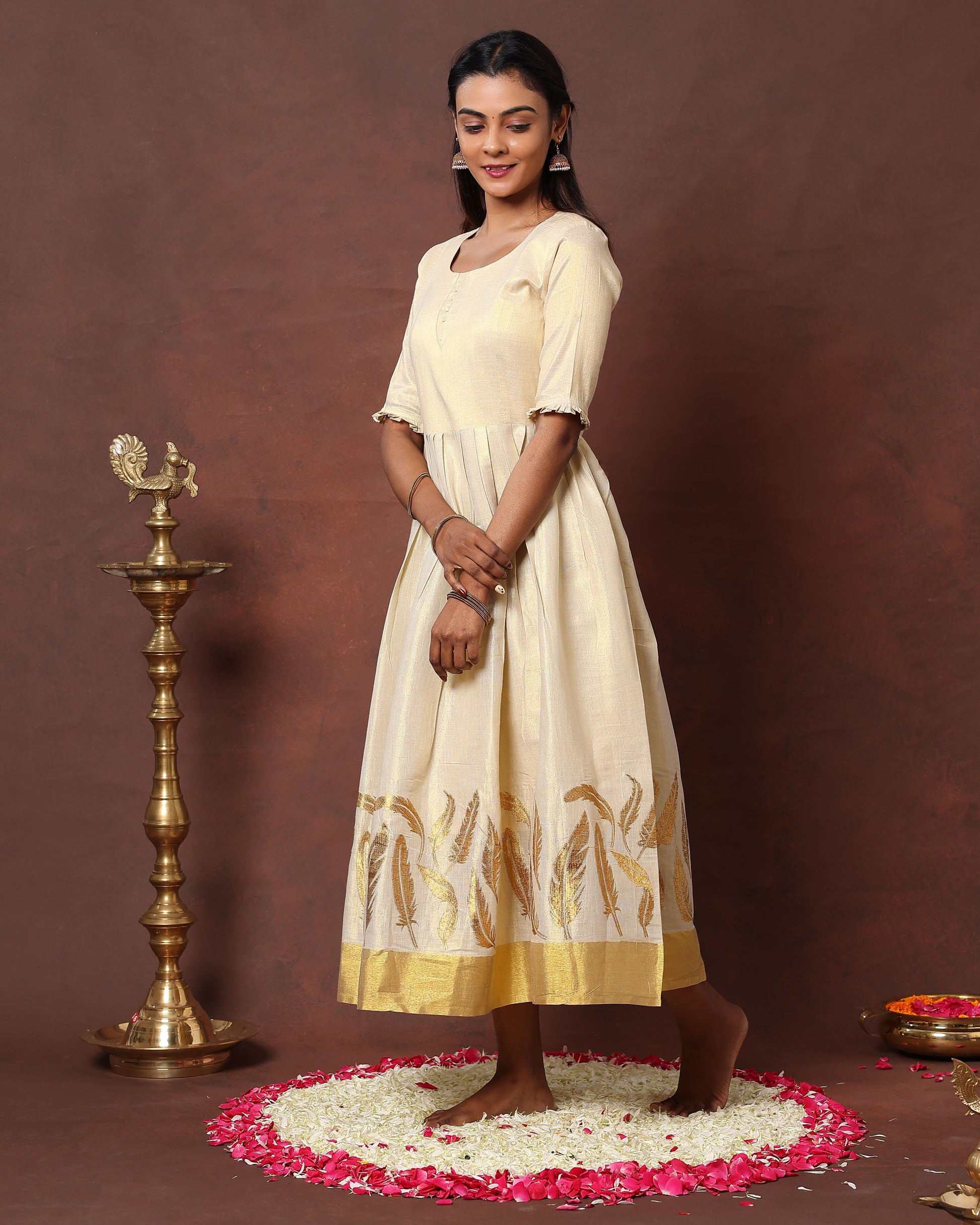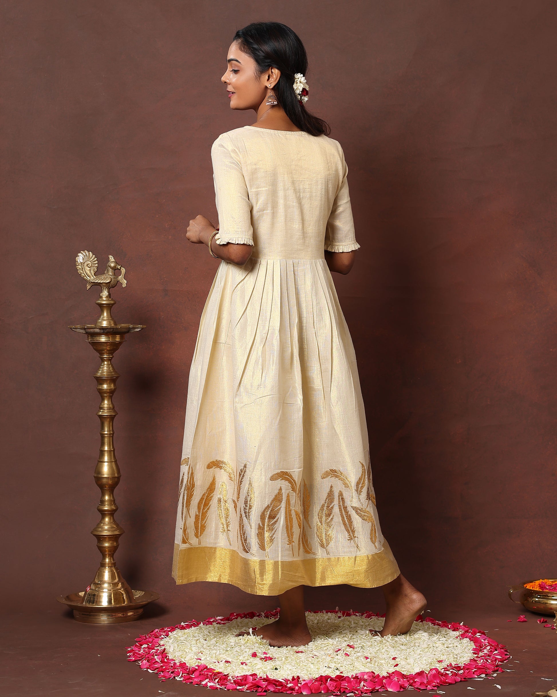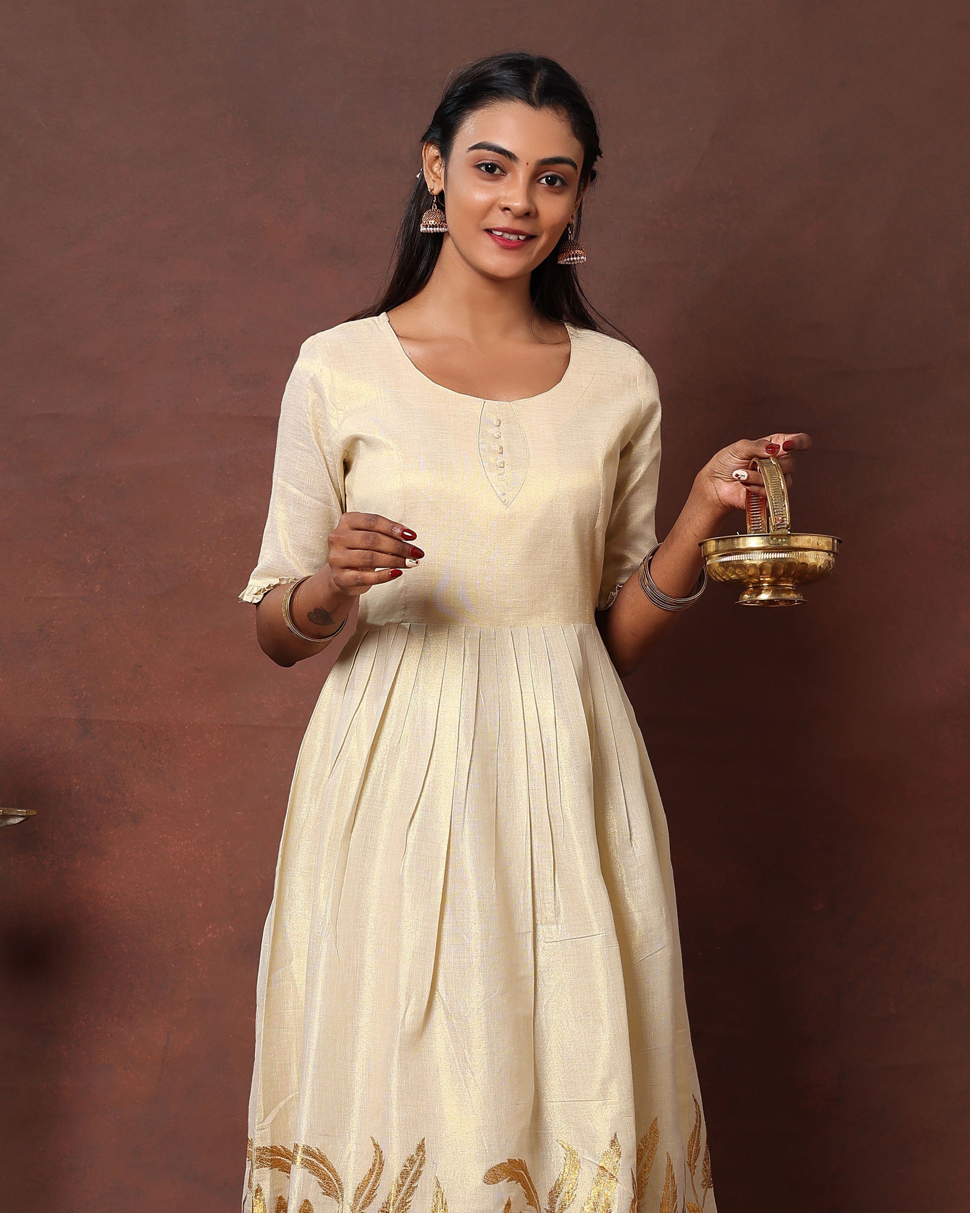 Women's Ethnic Pleated A-Line Kurta with Gold Feather Motif Border and Zari - Sandal