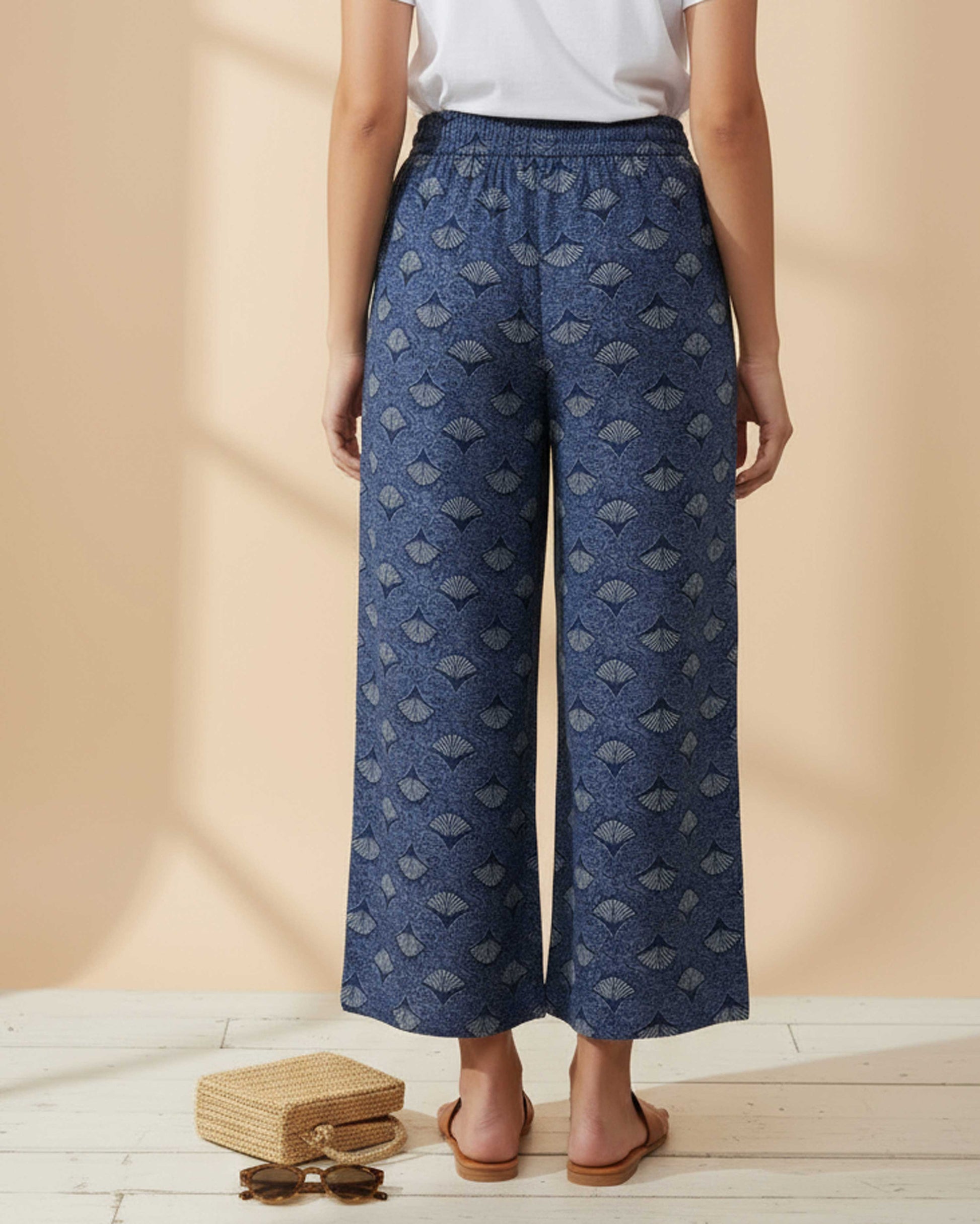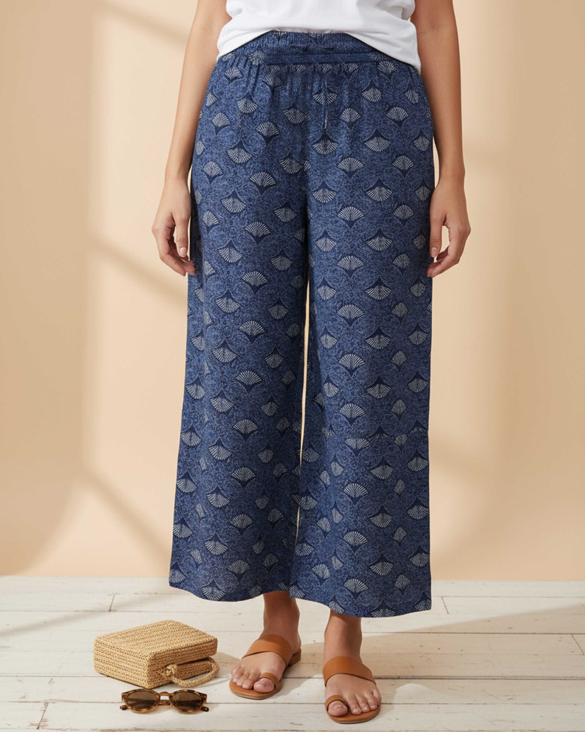 Women's Printed Wide-Leg Palazzo Pant with Elasticated Waistband -Navy Blue