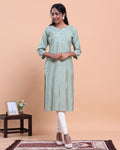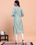 Women's Self-Design Straight Kurta with Round Neck and Thread Work - Light Green