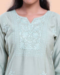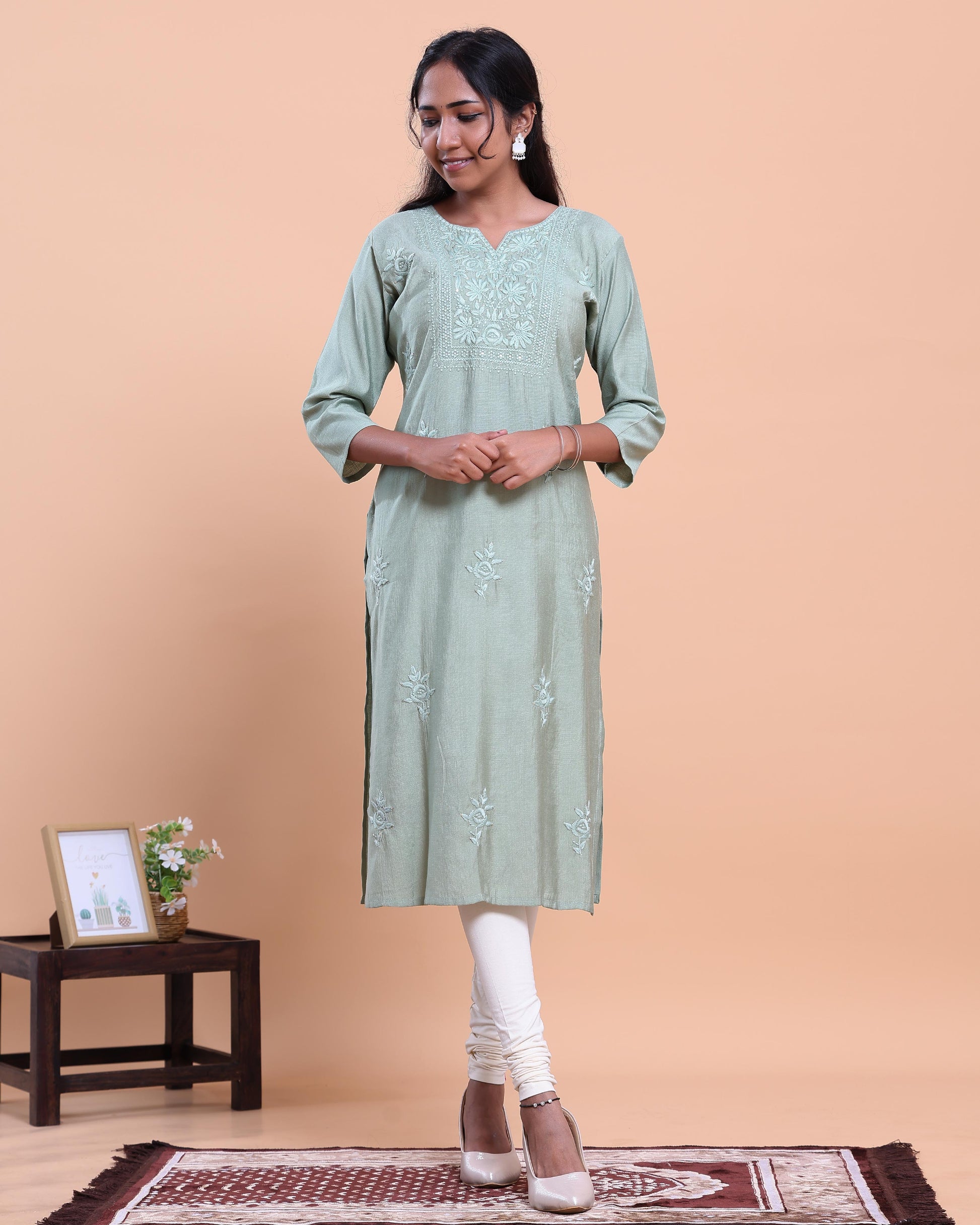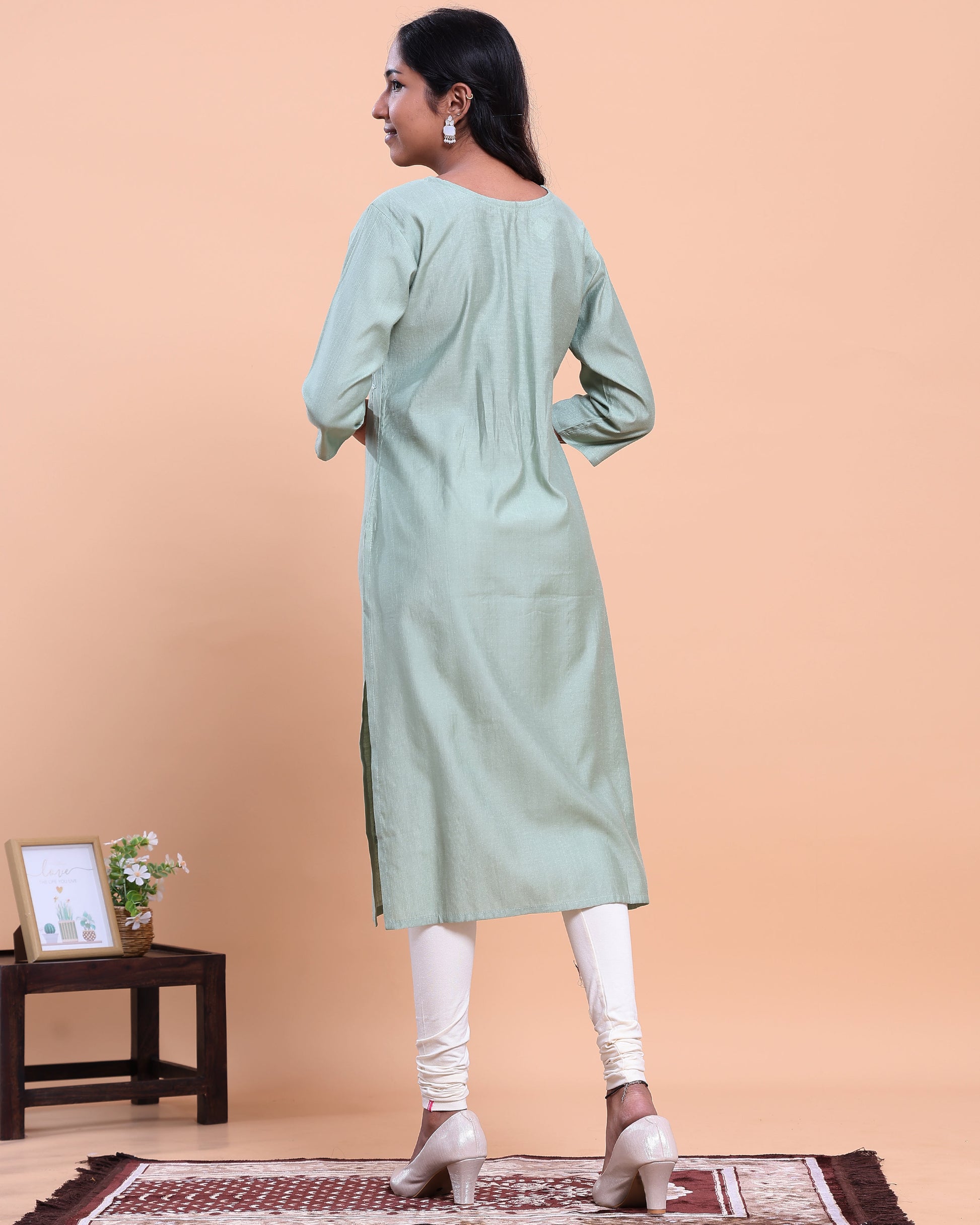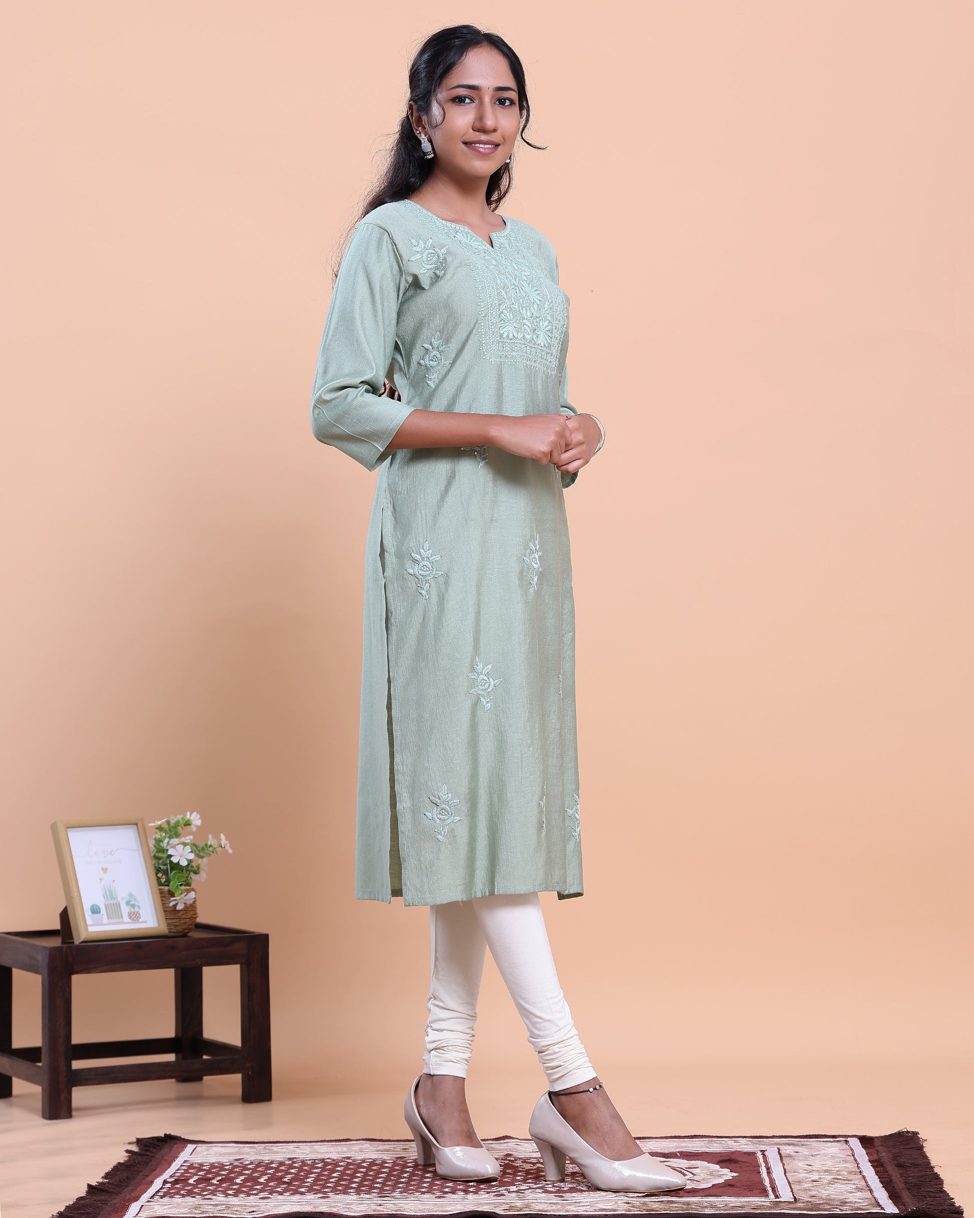 - Elevate your ethnic wardrobe with this elegant sea green straight fit kurta, intricate white chikankari embroidery on the yoke and body