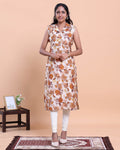 Women's Sleeveless Collared Floral Printed Straight Kurta - Off White