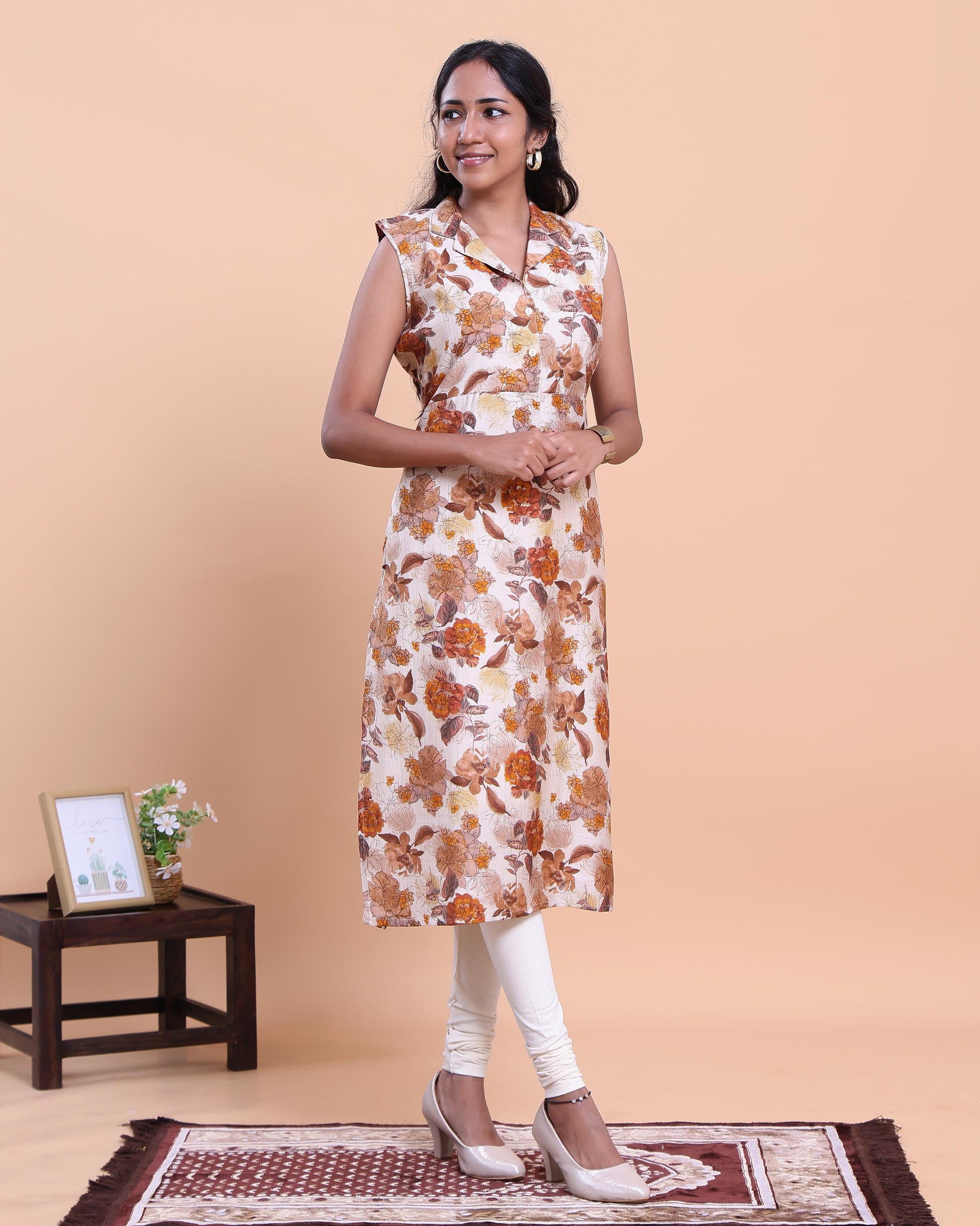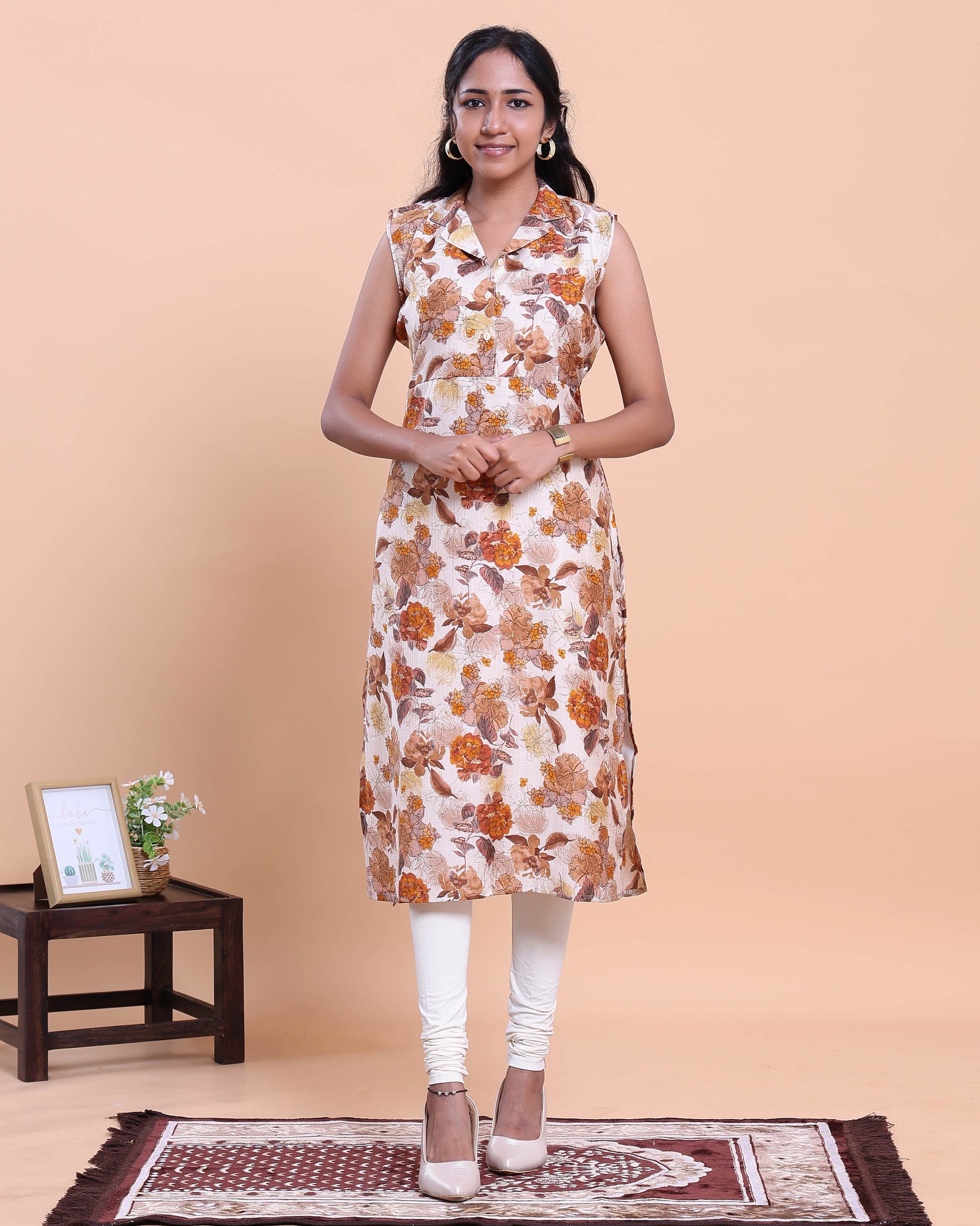 - Elevate your everyday style with this floral printed sleeveless kurta a classic shirt collar and a comfortable straight fit