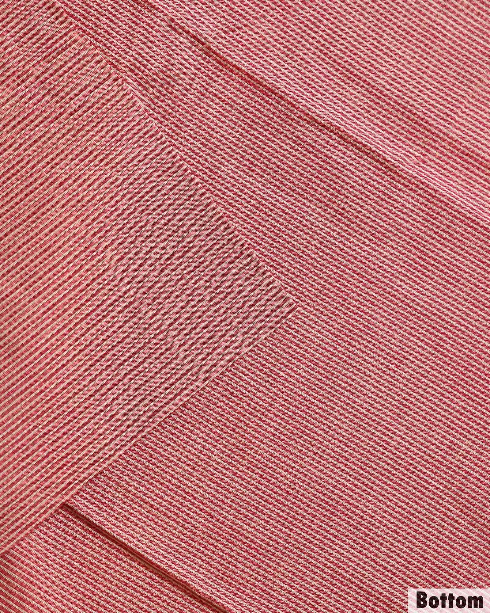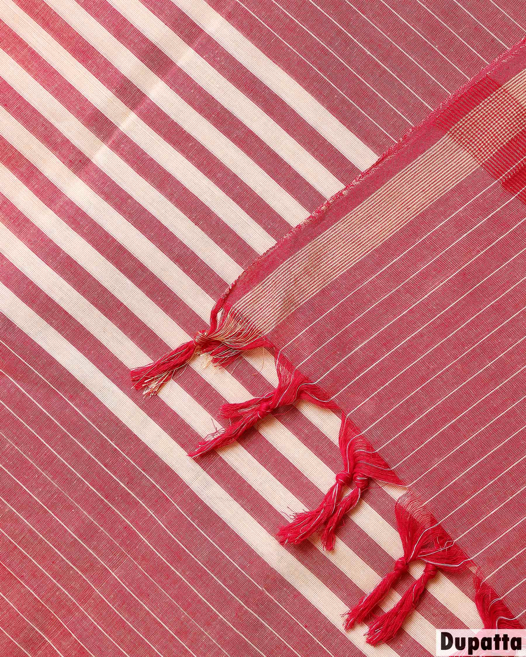 - Elevate your traditional style with this unstitched cotton salwar material a rich Beige top and a contrasting Red Striped Bottom and Dupatta adorned with a classic thread border.