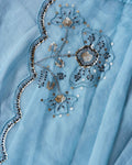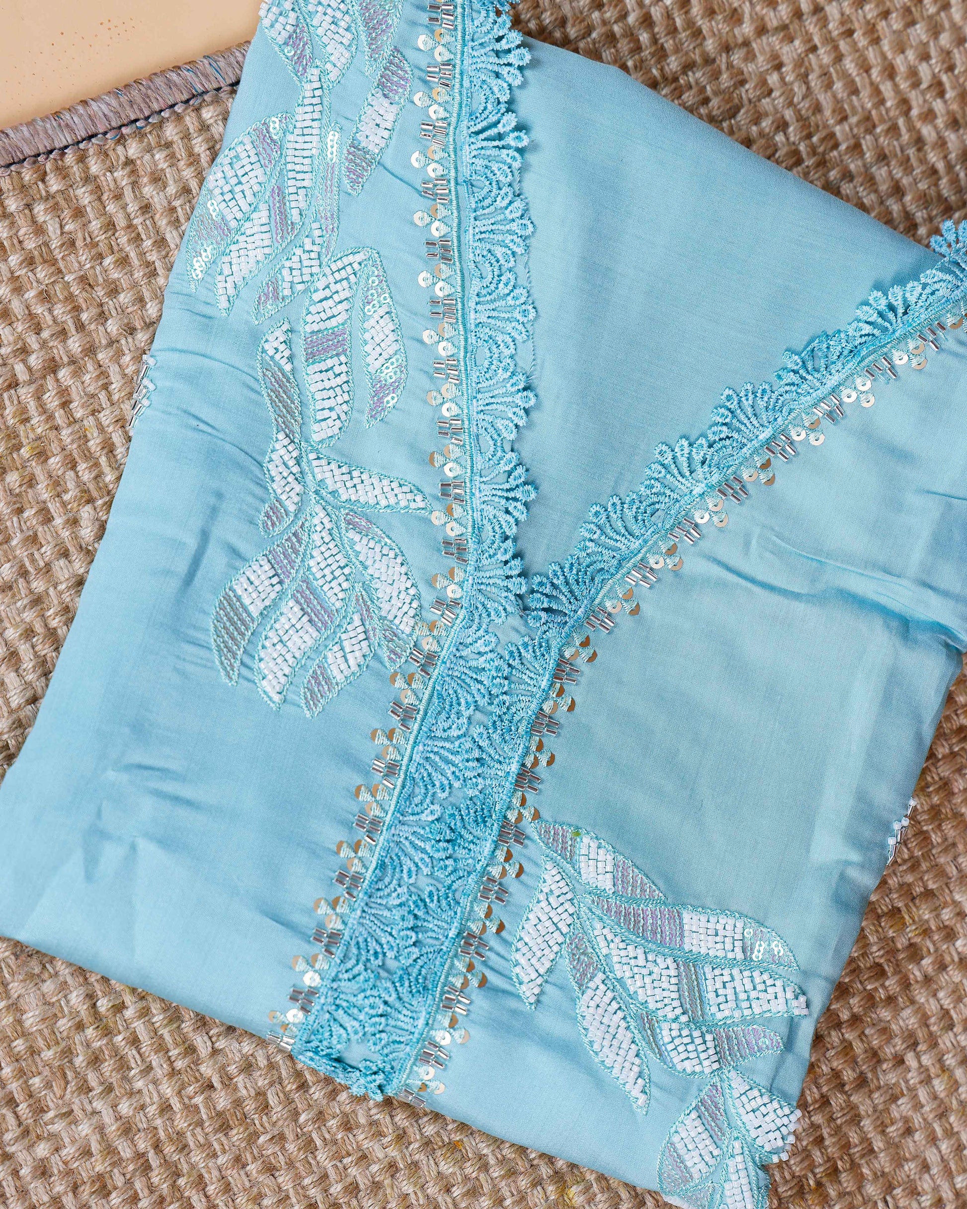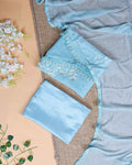 Women's Unstitched Salwar Material Set with Intricate Embroidered Neckline and Lightweight Dupatta - Blue