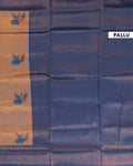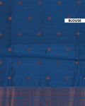 The saree is beautifully complemented by a rich, contrasting blue border and pallu, adorned with intricate zari weaving to create a sophisticated and festive look.
