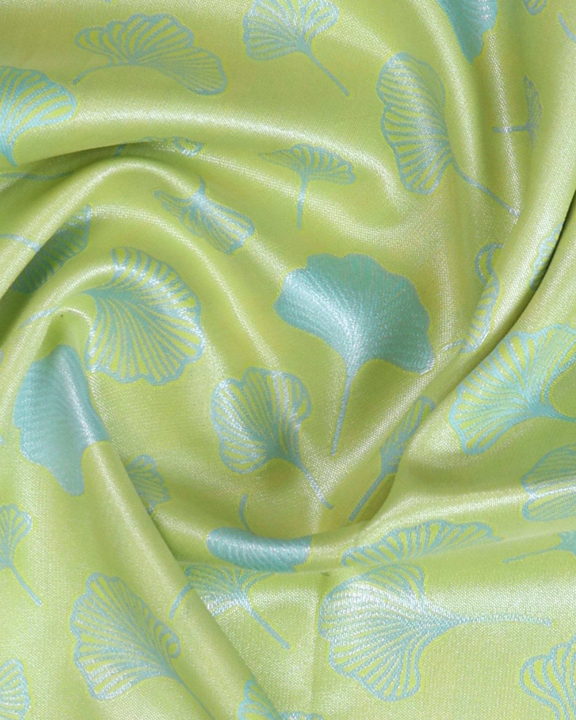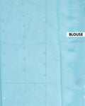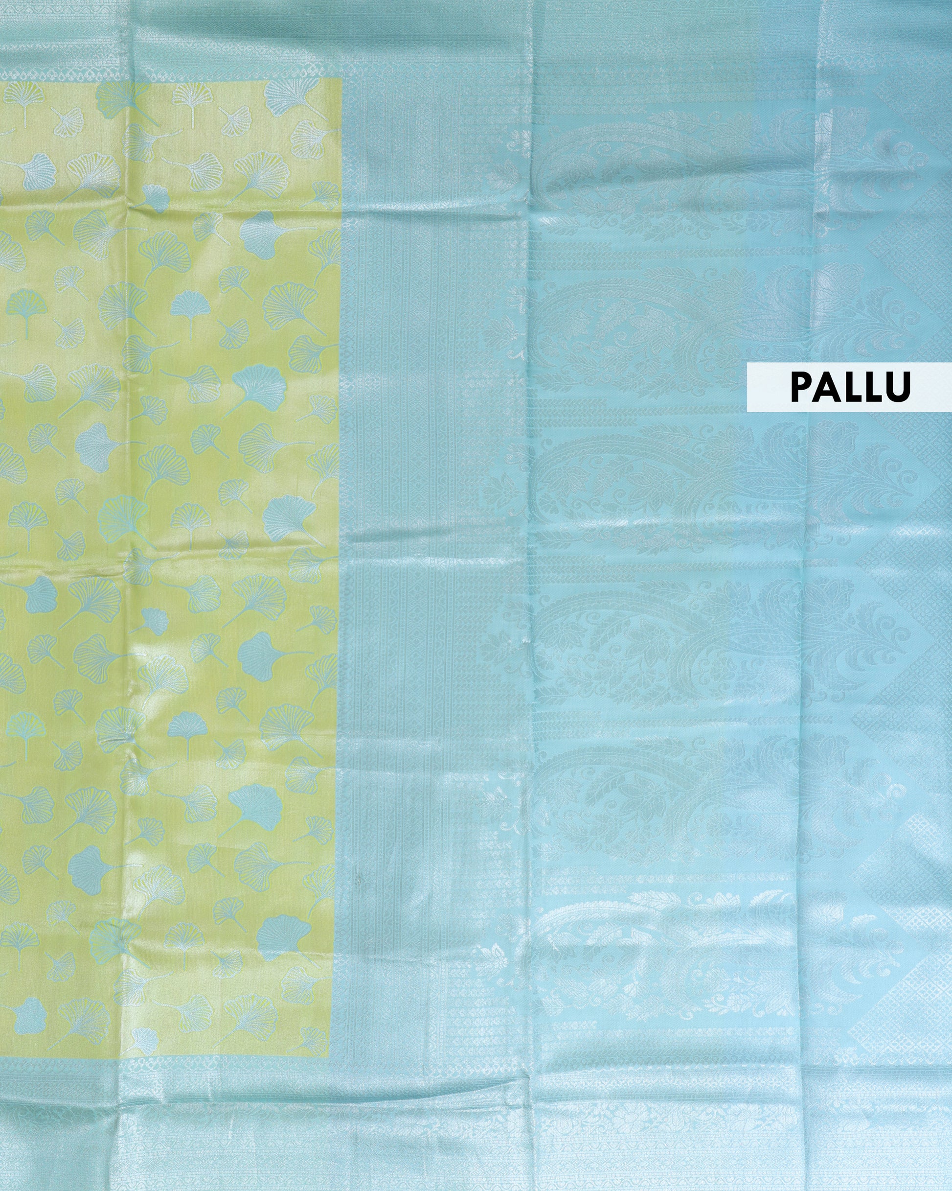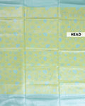 - This saree a light green top half with a subtle leaf pattern and a contrasting light blue bottom half with intricate zari work